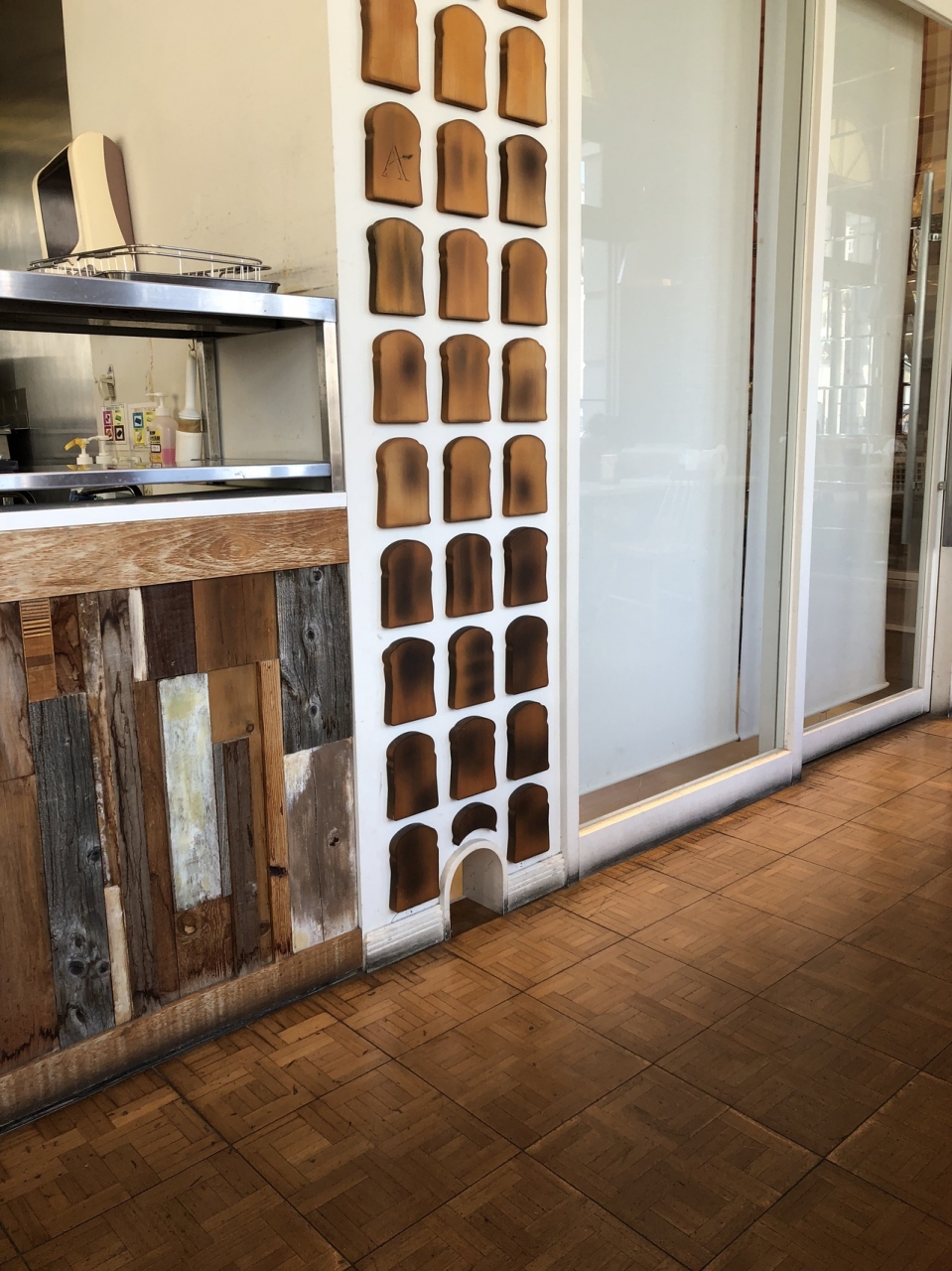 気になっていたけれどなかなか寄ることができなかったパン屋です。食べ物のあちこちにパン屋らしい遊び心がありました。扉の取っ手がメロンパンになっていたり、壁はパンのレンガ風で、下に行くにつれ焦げ目がついていました。