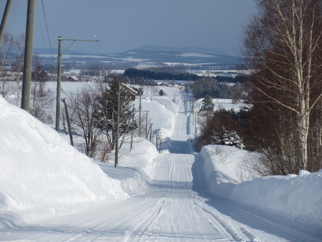 アップダウンの道を走っていると、真っ白な雪原が真下に