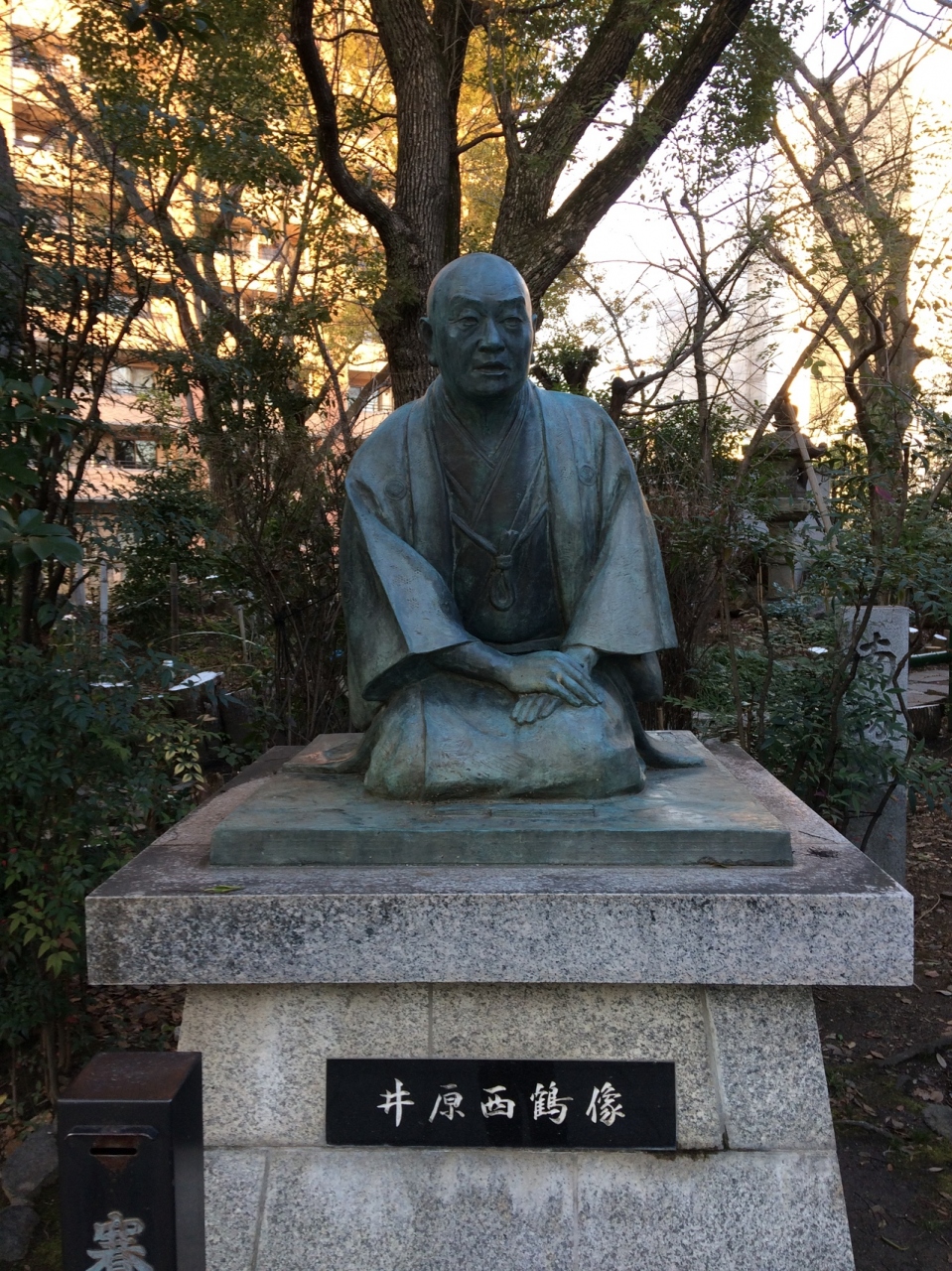 生國魂神社境内に井原西鶴の像がありました。