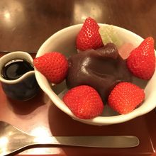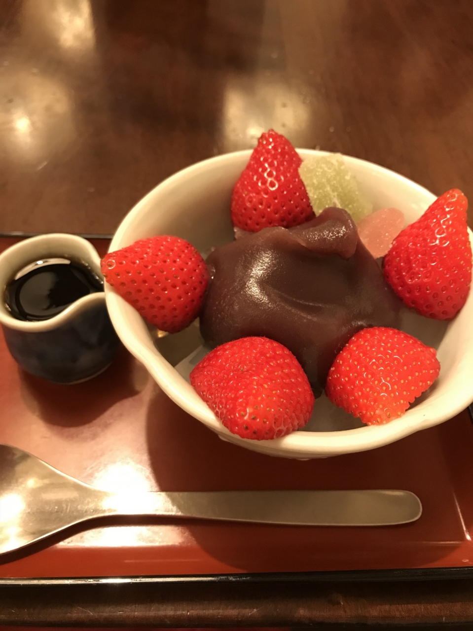 この時期ならではの、イチゴあんみつをいただきました。イチゴに蜜をかけるのは好きでないので、先にイチゴを食べました。あんが柔らかく、蜜と溶けてしまいます。個人的には固めのあんが好きなので、今度はおはぎを試したいと思います。