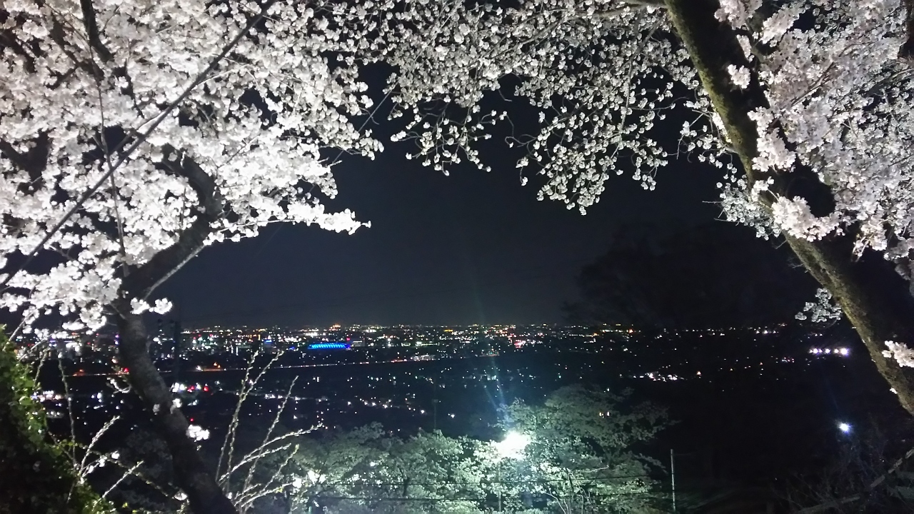 昼間は有料の駐車場が無料で、その周りや下のたくさんの桜がライトアップされて、夜景もとても綺麗でした。