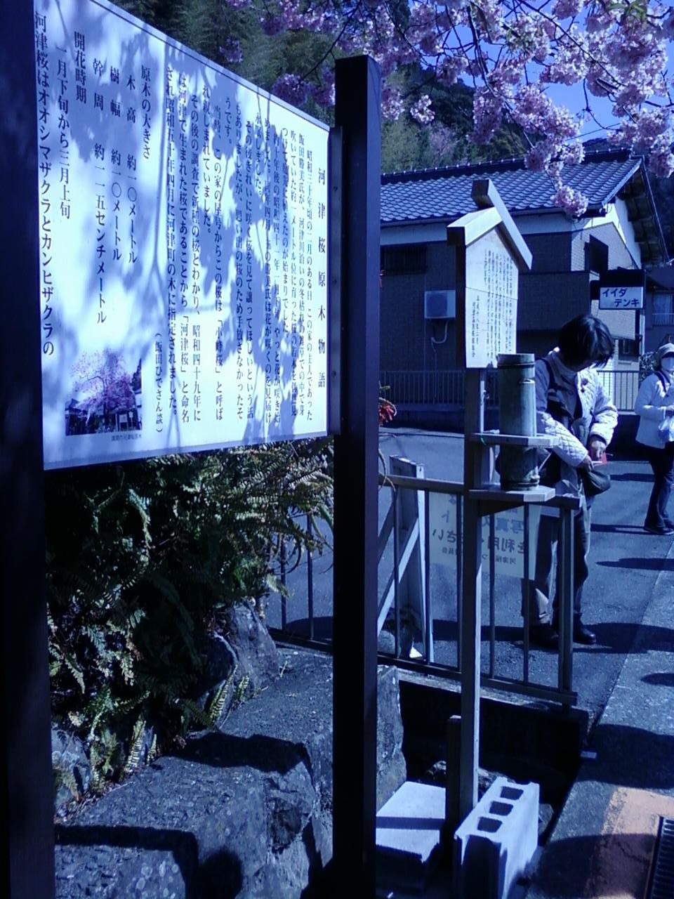 河津桜原木は、河津町に住んでいた飯田勝美さんが、1955年頃、河津川沿いで桜の芽を見つけて植え、それから10年以上が経ってか1月下旬から花を咲かせていたそうです。この原木が広まったおかげで、今や河津町が河津桜で日本中に有名な町になりましたね。当初は発見者の飯田さんの屋号から「小峰桜」と言われていたそうです。でもその後の調査で、これが新種のもので、河津町に原木があることから、1974年になって河津桜と命名されたようですね。この原木のある場所は、いわゆるメインの桜並木からは少し離れた、また河津駅からは15分くらい離れたところにあるので、わかりづらいのと、そして残念なことに歩道の幅のほとんどない道の脇に桜が植わってあり、そのそばをビュンビュン車が通っているので、写真を撮る場合は慎重にしなければなりません。旅行者やら通行人やらでここはかなり道路にはみ出していました。ドライバーもここだけ道路に人がはみ出しているので、結構注意が必要なのでは。まさに民家の桜なので、これだけの人が訪れますから、今後は事故を防ぐためにも対策が必要かな、と思いました。