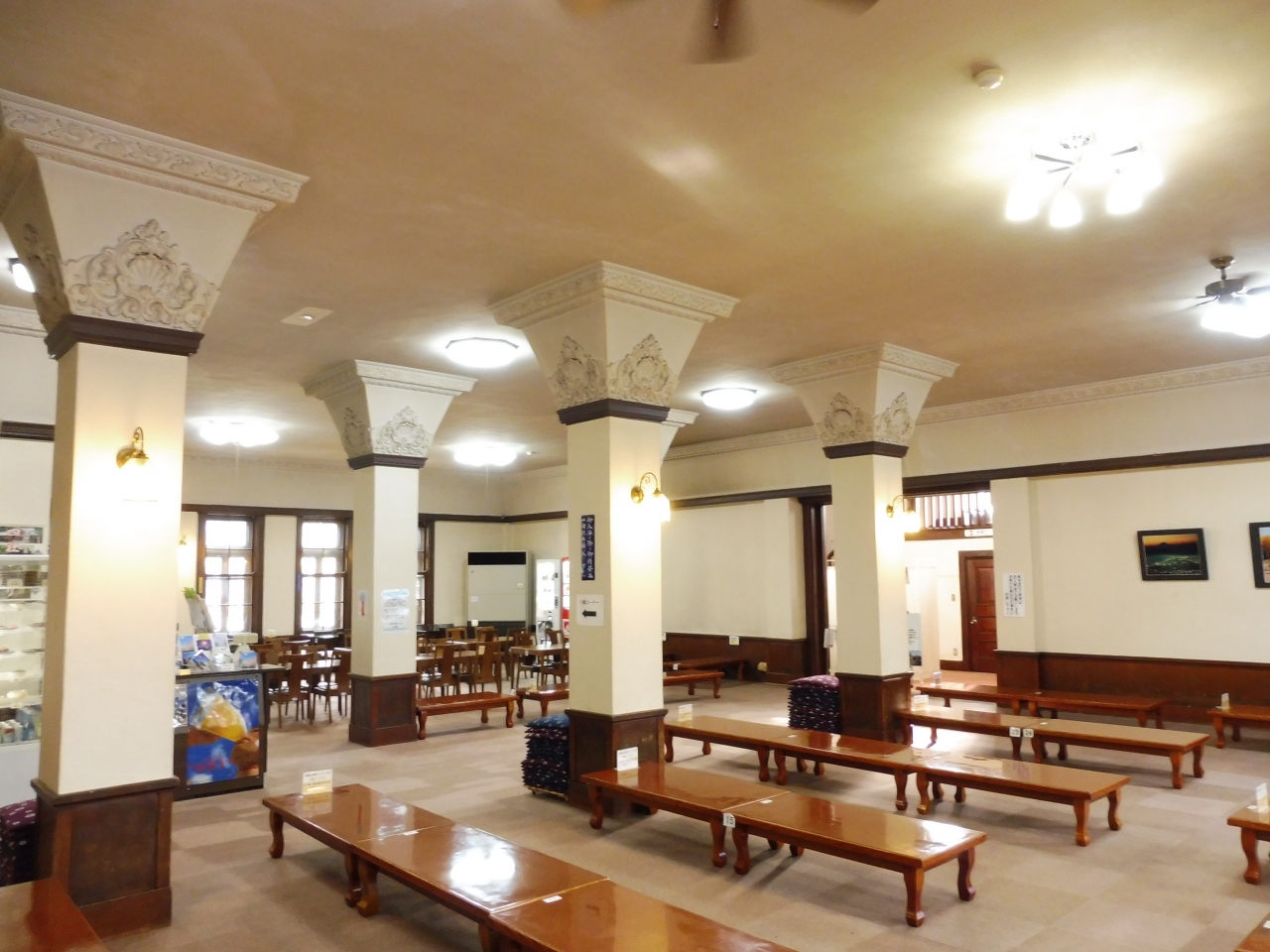 装飾された柱や天井ランプを眺めながらレトロ感を満喫出来る場所です。