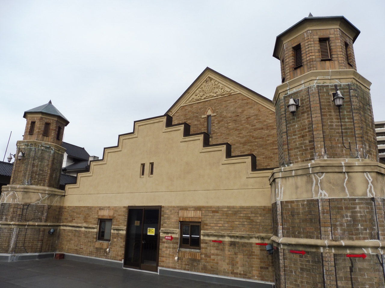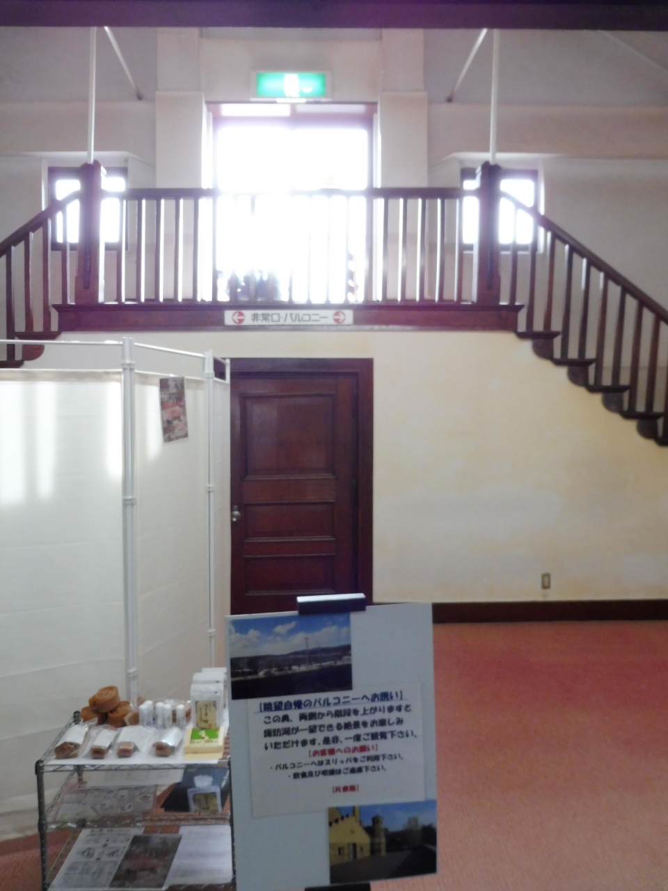 でもここの食堂の先にはさらに上の展望バルコニーに向かう階段が有るのでその眺望を見てほしい!此処まで来ると諏訪湖がすぐ目の前で建物の外壁や特徴的な屋根や煙突も真近で観察出来ます。