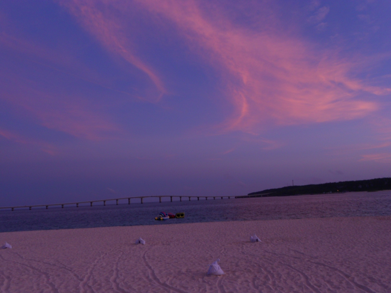 来間島と来間大橋のほうを見ると、ブルーの空にピンク色の雲がとても綺麗でした。。。
