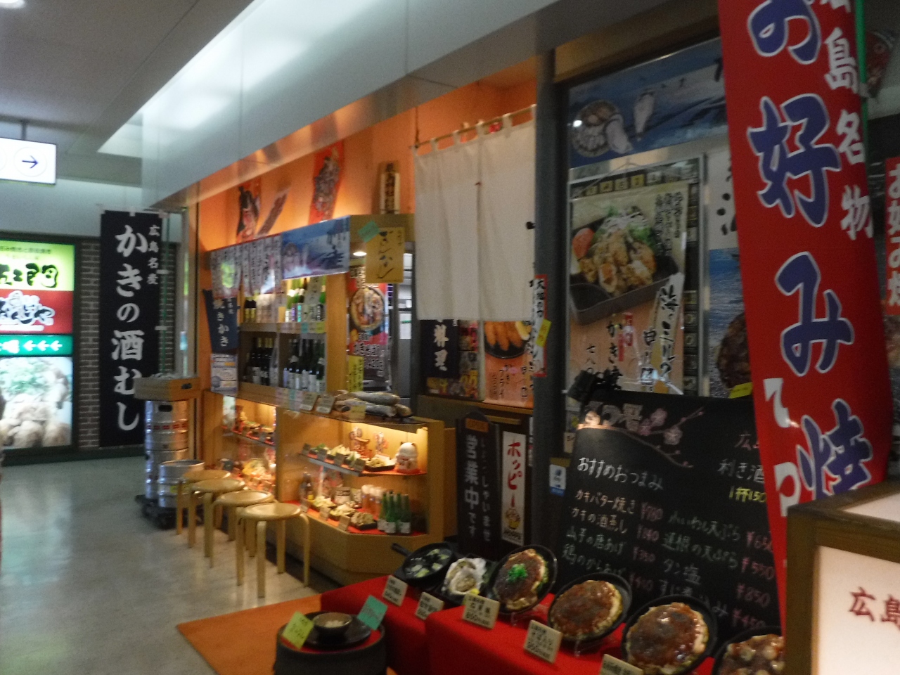 広島空港内の3階レストランフロアにあるお店です。居酒屋風のお店で、広島名物のお好み焼きやかきを使った料理などをいただけるお店です。アルコールもあります。広島焼きはたっぷりのキャベツとやきそばがソースとマッチしとてもおいしいです