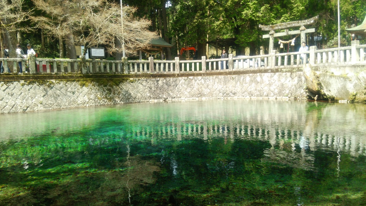 日本百名水にも選ばれている水源です。厳島神社の敷地のそばにエメラルドグリーン色の透き通った池がありました。近くの方々がペットボトルに水を汲んでいました。名水でマスを養殖していて、マス料理を提供する食堂もありました。厳島神社では御朱印は無理でした。