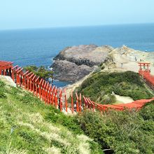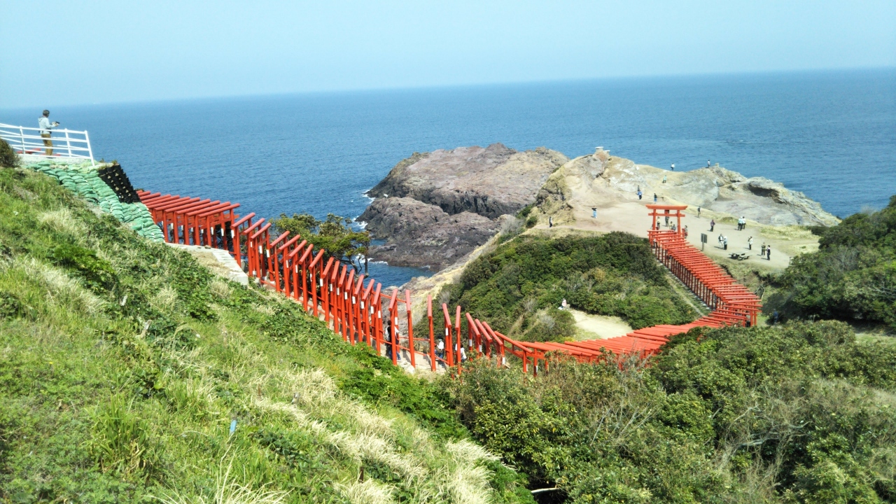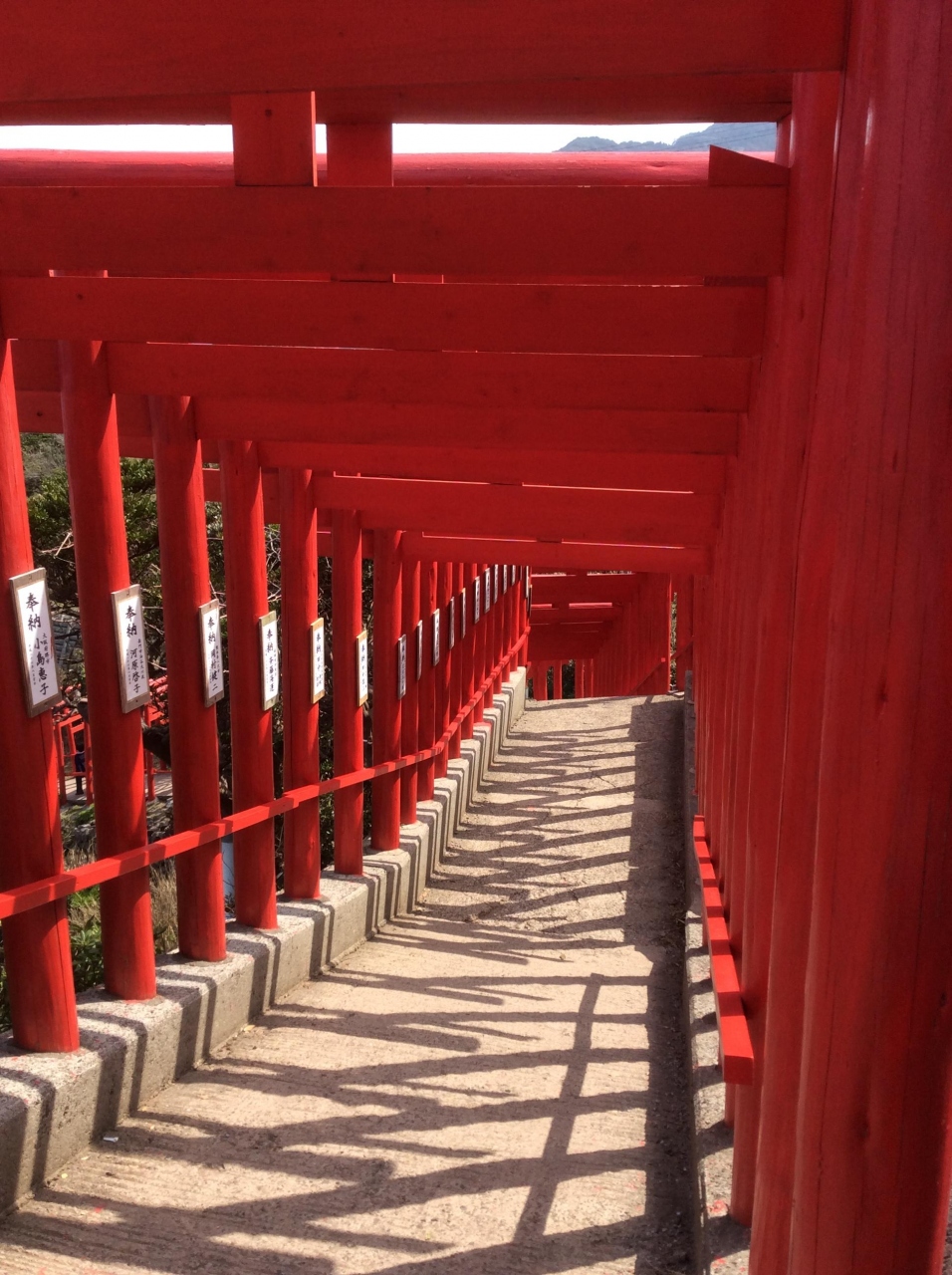 123基の朱色の鳥居が海の青さと木々の緑に映え、美しく印象的な絶景が目に焼きつきました。駐車場は山側の鳥居の近くにあるのですが正式な参拝の仕方としては、まず坂道を下り海側の鳥居まで行きそこから鳥居の下をくぐりながら昇っていくそうです。険しいところに作られているので高低差もあり急勾配のところもあるので足元には注意が必要です。