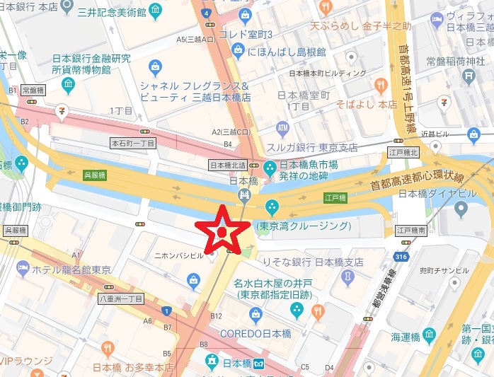 日本橋由来記の碑は、日本橋から約30mほど南西側の袂にあります。