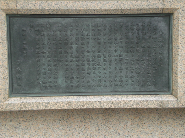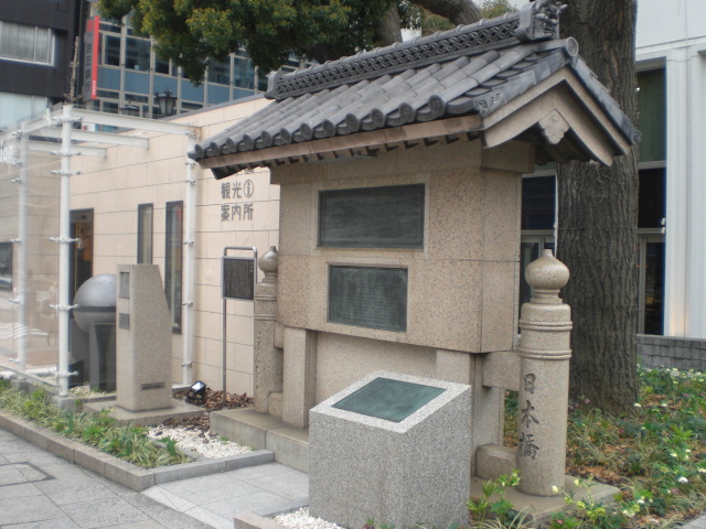日本橋由来記の碑は、日本橋の南西側の袂にあります。観光案内所の横にあります。