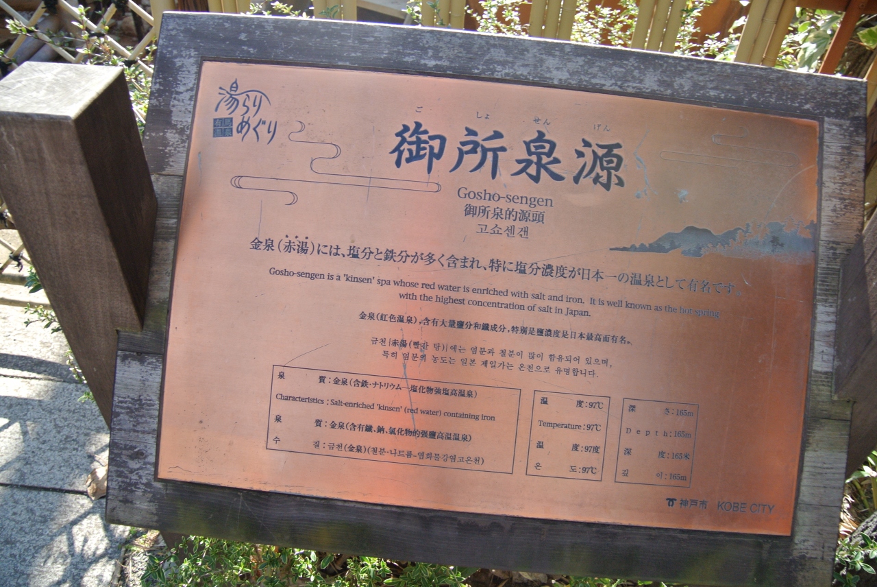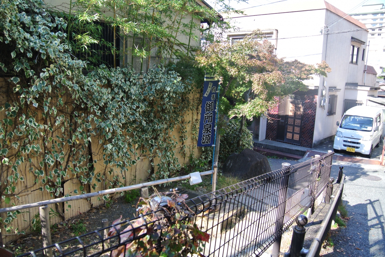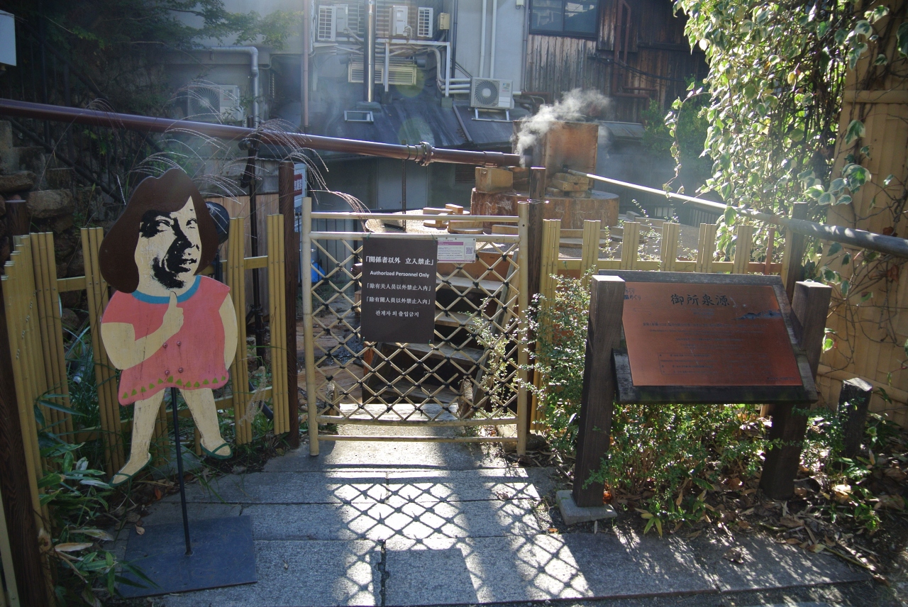 極楽寺など寺院が集まるエリアから坂を降りたところの住宅街の中にあります。竹の柵や門があり、関係者以外立ち入り禁止になっていたので、柵の外から眺めるだけですが、その時はあまり湯けむりはのぼっていませんでした。なぜ「御所」泉源というのかなあとちょっと不思議に思っていましたが、説明のプレートにも「御所」と言う名前の由来については書いてありませんでした。
