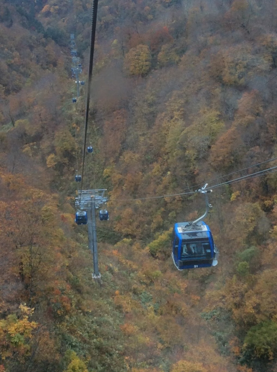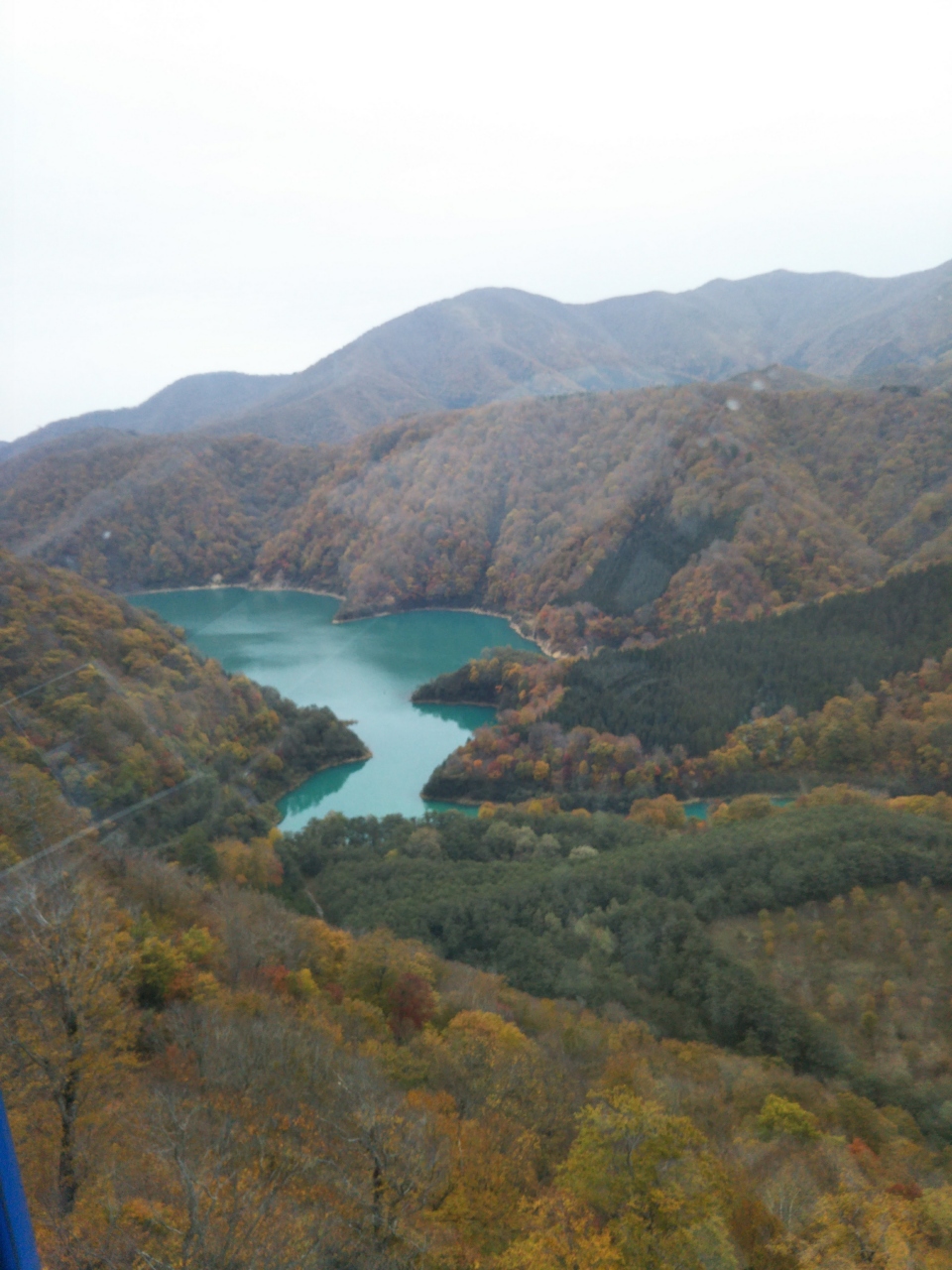 紅葉を目当てに、一度は乗ってみたいと思っていたドラゴンドラを利用しました。次々とやってくるゴンドラに急いで飛び乗った次の瞬間には目前に深い谷底が開けて思わず声をあげてしまいました。降下して行くときにはゴンドラごと前傾するので思わず手すりのバーを握り締めるほどのスリルを味わいながら紅葉を楽しみました。左側に見えてくる二居湖のエメラルドグリーンの湖面もとてもきれいでした。
