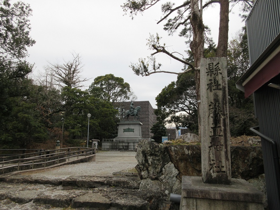 高知城の大手門に向かってお濠を渡る手前、右手の山之内一豊の像に向かう道の端に、古びた石碑が一本立っていて、何だろうかと覗いみると、それが藤並神社跡を示す碑でした。今は祭神も他に移されたようで、鎮守の森のような鬱蒼と生い茂る木々が、神社の嘗てこの地にあったことを伝えているかのようでした。