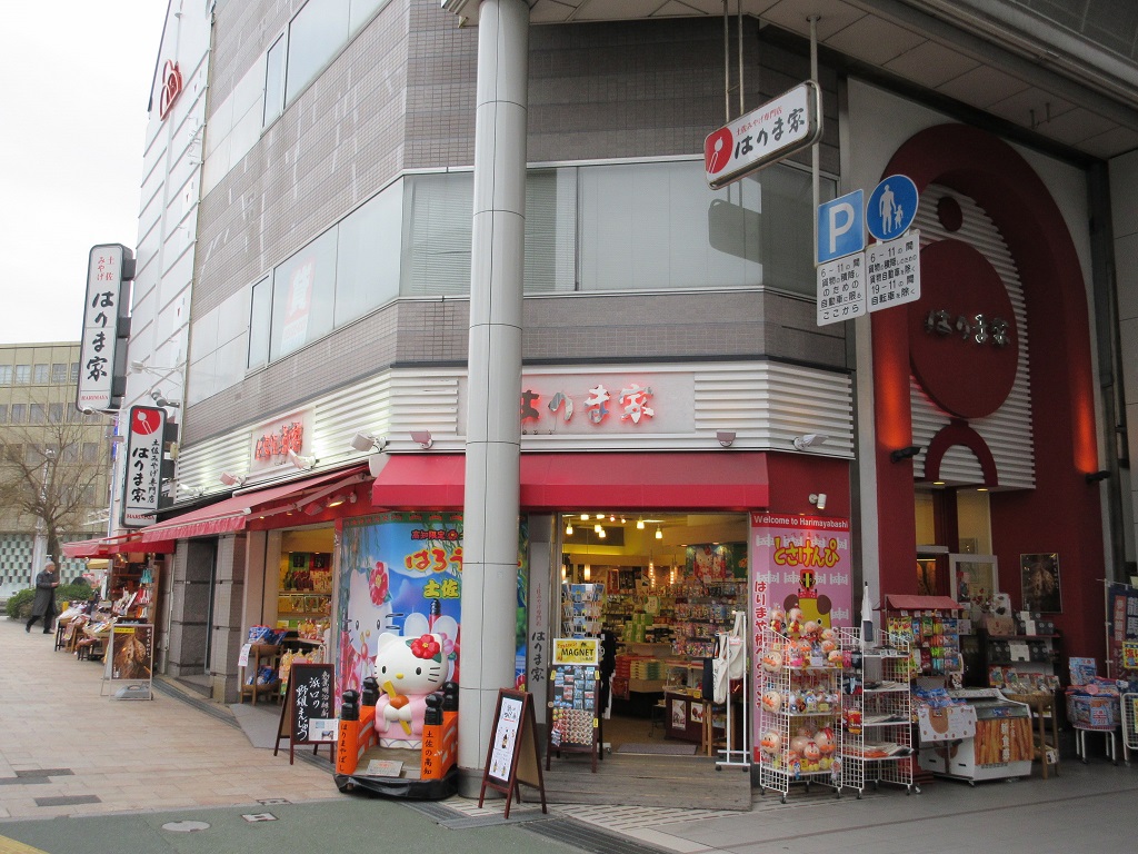 高知観光の際に必ずといって良いほど立ち寄る京町商店街入口に、ピンク色の着物を着たキティちゃんが置かれたお店があり、なんだろうと覗いて見ました。ここが高知土産のお店として有名な「はりま家」の京町店とのことで、芋けんぴなど定番のお土産はもちろんですが、キティちゃんのキャラクターグッズも多数あって、一風変わった雰囲気のお店でした。やはりはりまや橋キティそのものが旅行の土産話にもあるので、目が行ってしまいました。