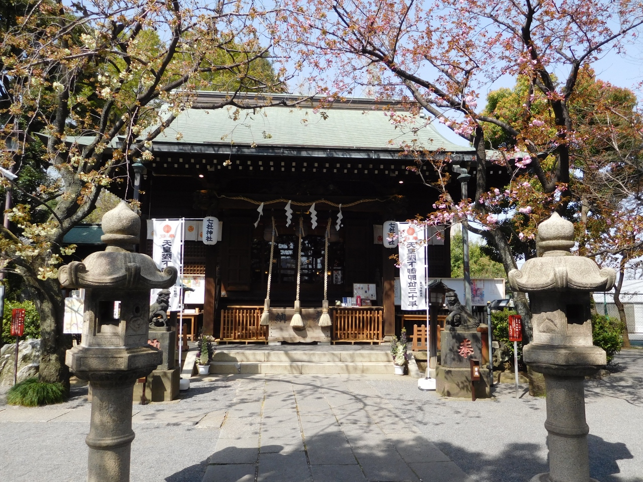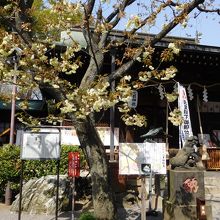 閑静な場所にあり、とても落ち着いた雰囲気の神社です。社殿の両脇には紅白の八重桜(右側はピンク色の福禄寿、左側は薄緑色の御衣黄)が咲いていて、葉桜に近くなってしまいましたが、ちょうど咲いている時に見る事が出来て良かったです。また、社殿前には、雄犬と雌犬の両方共、子供を抱えた狛犬が鎮座していました。御朱印は、奥の方にある社務所のチャイムを鳴らしてお願いをしました。待っている間に温かいお茶を出して頂け、とても嬉しかったです。また、桜の小判が入った「さくらみくじ」は、桜の形に花開く珍しいおみくじでした。