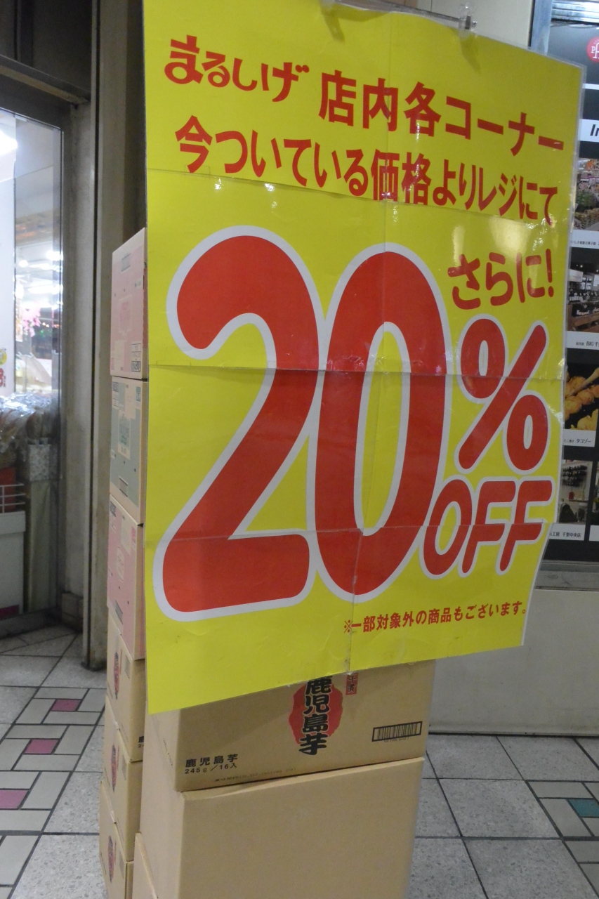 地下鉄の駅からエスカレーターを一階に上がったところにあります。そこで目にとびこんできたのが「20%OFF」の文字!ポテチ、グミ、チョコレート、ぼんち揚げなど、ついついテンションがあがってしまって、たくさん買い込んでしまいました。たいがいのものは安いですが、中にはそうでないものもあるので日ごろからスーパーなどで値段をチェックしているといいですよ。
