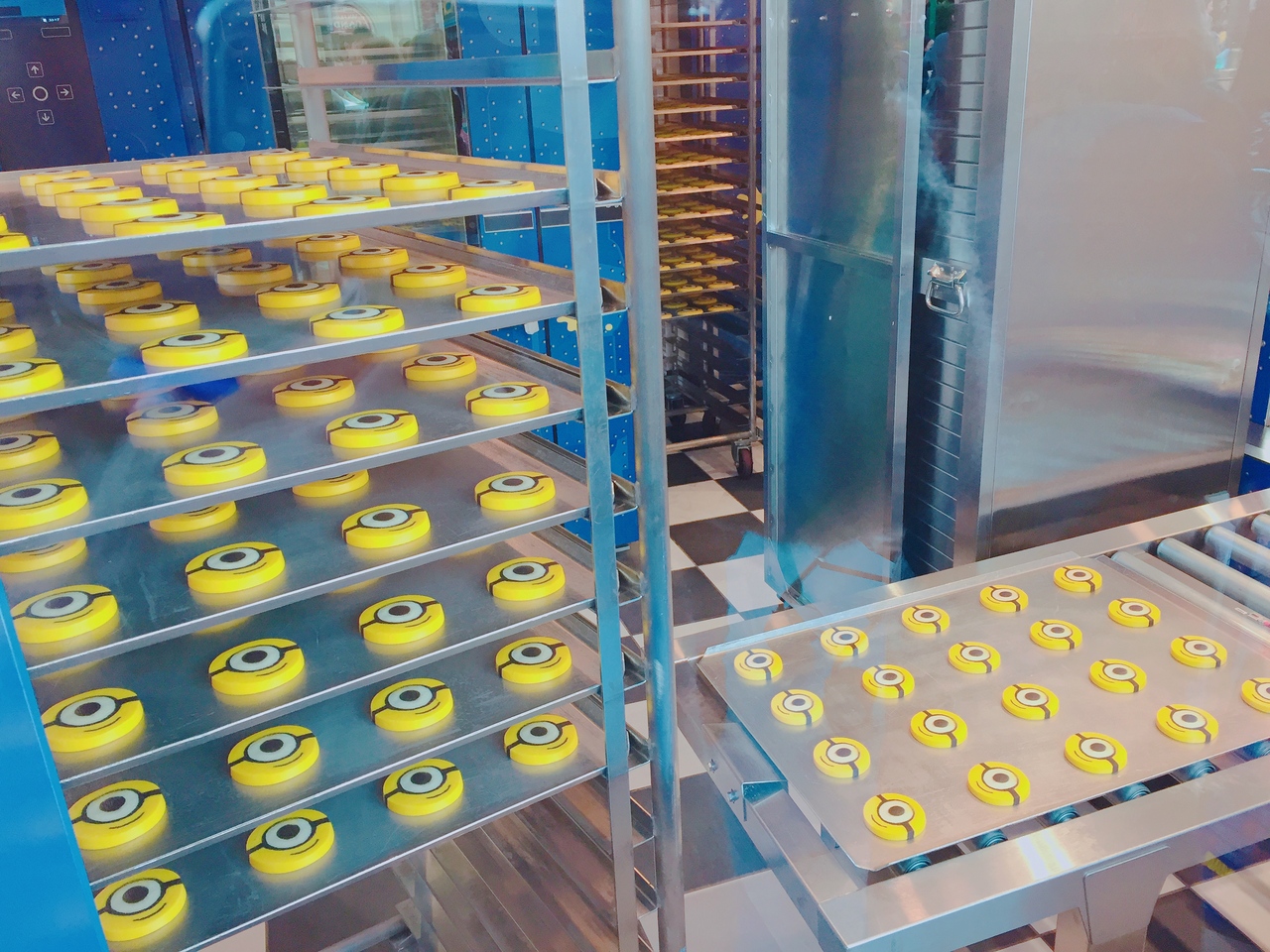 ミニオンの顔(目?)の形のクッキーにアイスが挟んであるクッキーサンド、なかなか大きくて美味しかったです。 クッキーを実際に焼いている行程も列に並びながら見学できるので楽しいですよ。
