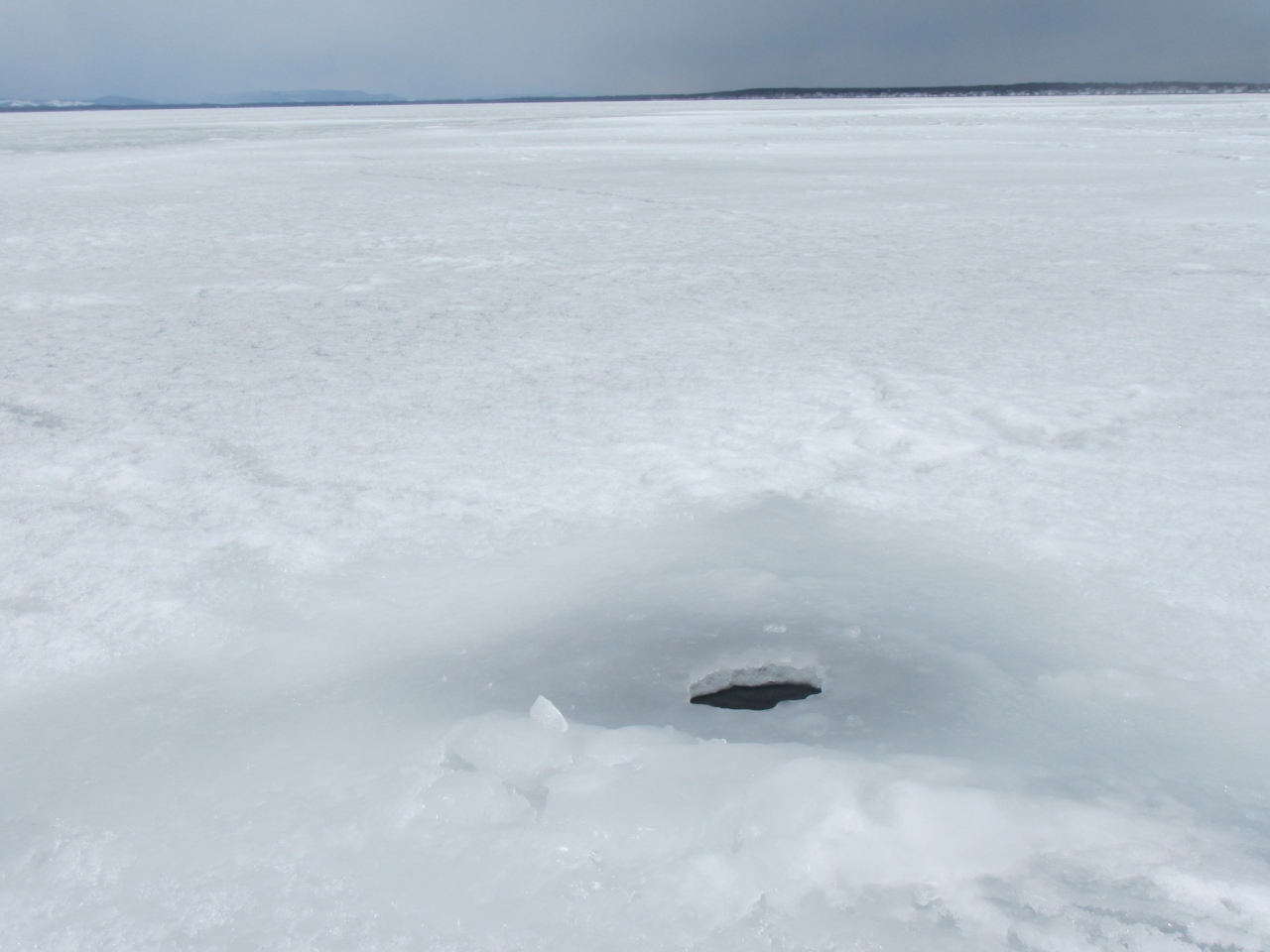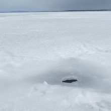 そして、解氷域は湖の中ほどまで広がり、その周辺は幾筋ものヒビが走り、水面の覗く穴もありました。