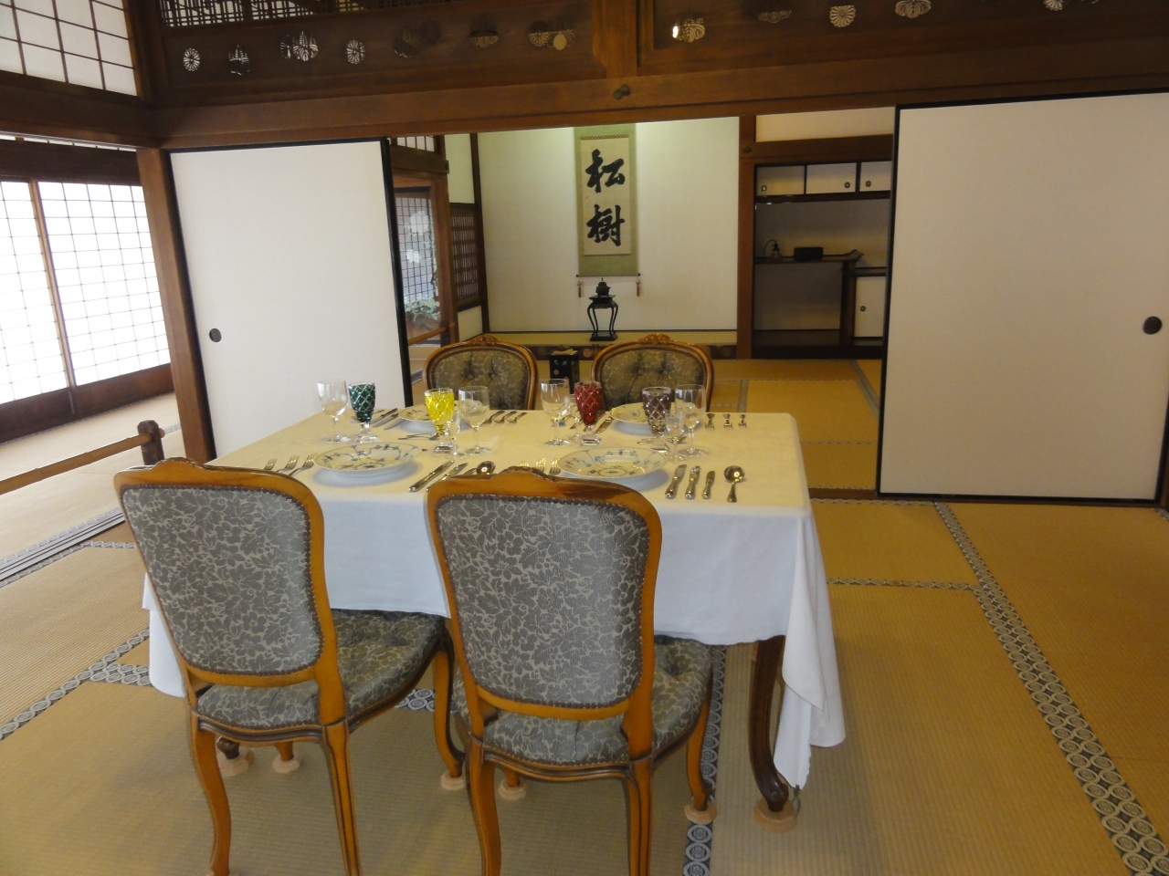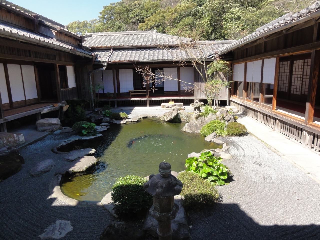前回はツアーで素通りしたので今回は内部見学しました。謁見の間や文書記録をする秘書の部屋、身支度する部屋、トイレや寝室、中庭、ドラマにも登場したテーブルの間等の他、古い写真で島津家や訪問客のことも紹介していました。お殿様の生活空間を見る入場料は¥300、見応えあります。中庭に面する縁側でひと休みしてる方も居ました。