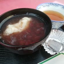 私の思っていたぜんざいと違う(笑)小豆色の汁にもちが入ってると思ったら、なにか汁が透明に近い感じ。小豆の粒もよく見えます。とっても大粒の小豆で、とっても甘い味付け。水あめでも入ってるのか?と思うほどの甘さのあるぜんざいで、添えられた塩こぶが嬉しかったです。