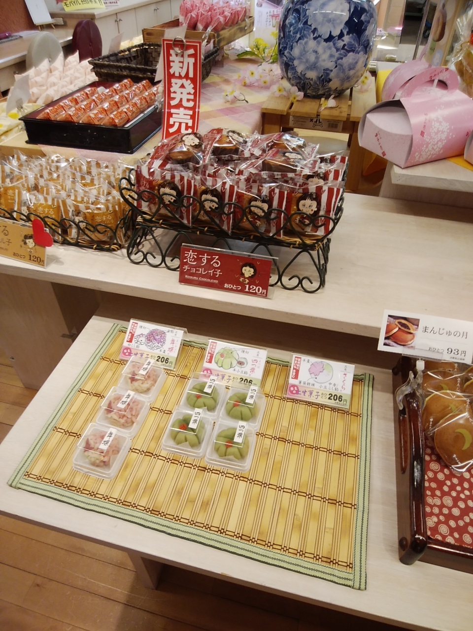 地元のお菓子チェーンです。和洋各種お菓子がそろってます。駐車場が広く、建物も雰囲気ありますよ。アプローチのお花がきれいに手入れされていて好感です。洋菓子の新商品、恋するふたりの物語 キャラメル子とチョコレイ子を4つずつ購入しました。イメージキャラクターの描かれた専用箱に入れてくれます。小ぶりなしっとり焼き菓子でお茶請けに良いです。