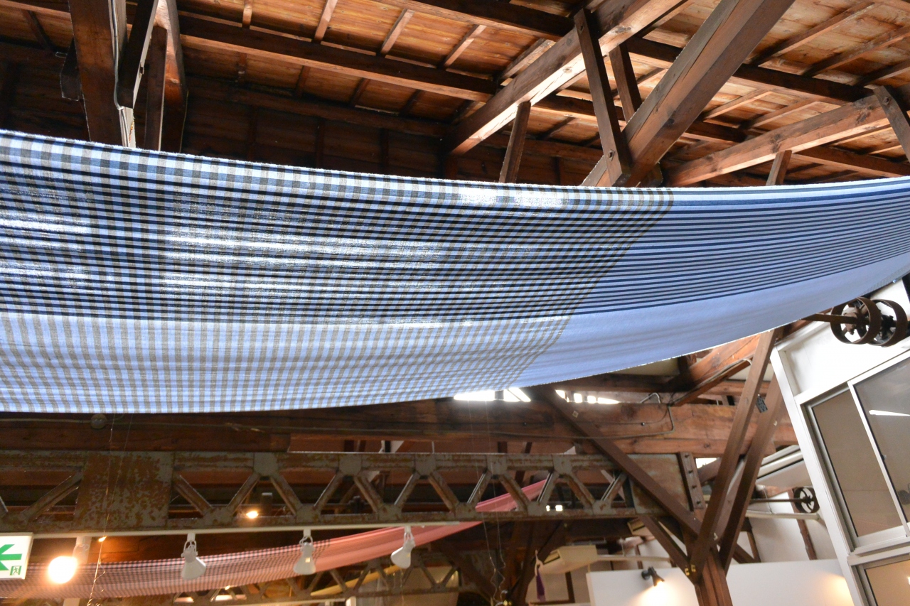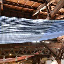 昔ののこぎり型をした播州織の工場を利用して播州織の製品を販売しています。織機もあってデモンストレーションで布を織る所を見せてくれます。播州織は糸を染めてから織るので色落ちがしないそうですよ。スカーフ、洋服、鞄など色々な商品を売っていましたが、一番人気はストールでした。クレジットカードもOKでした。