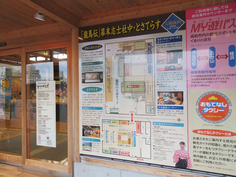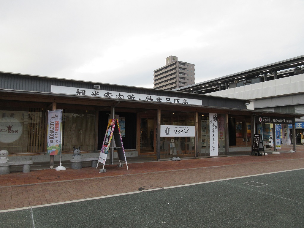 JR高知駅を南側に出ると右手に「とさてらす」という平屋の観光案内所と土産物屋が一緒になったような施設があり入ってみました。高知市の観光案外意外にも高知県全域の観光案内資料も入手できます。また、それほど面積は大きくないですが、お土産、特に野趣あふれる農産品を多くあつかっていました。市内にある土産物屋さんに比べると、売れ筋を販売するのではなく、広く高知県内全域の土産物を揃えた町おこし的な要素もあって、性格が些か異なるように感じられました。