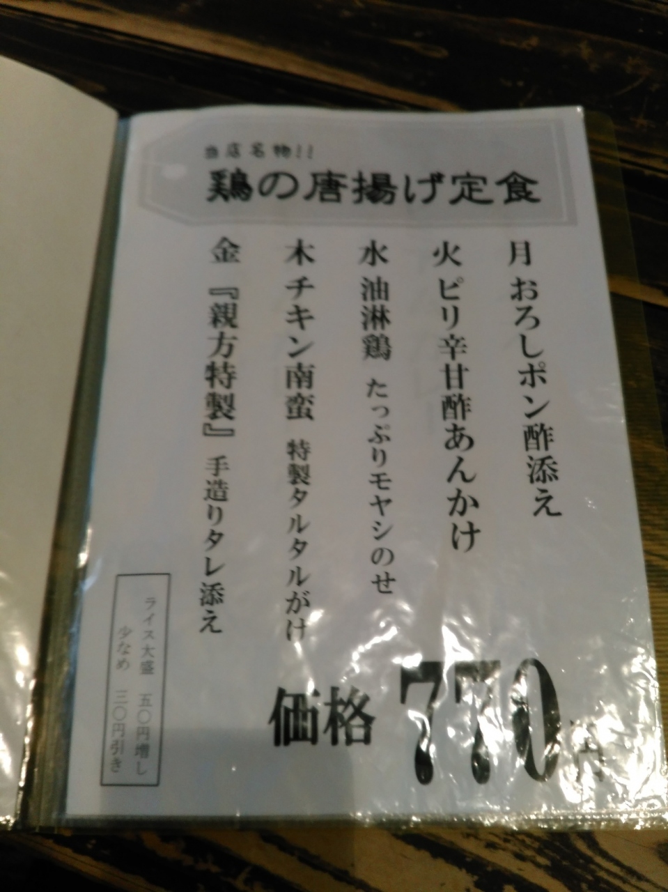 県庁直ぐ裏にあります。40人は入れます。夜は名前のとおり居酒屋ですが、昼は定食を提供しています。ランチは親方おまかせ日替わり定食があり、20食限定で700円です。鶏の唐揚げ定食770円は曜日で味が変わります。唐揚げ好きは是非行ってみてください。