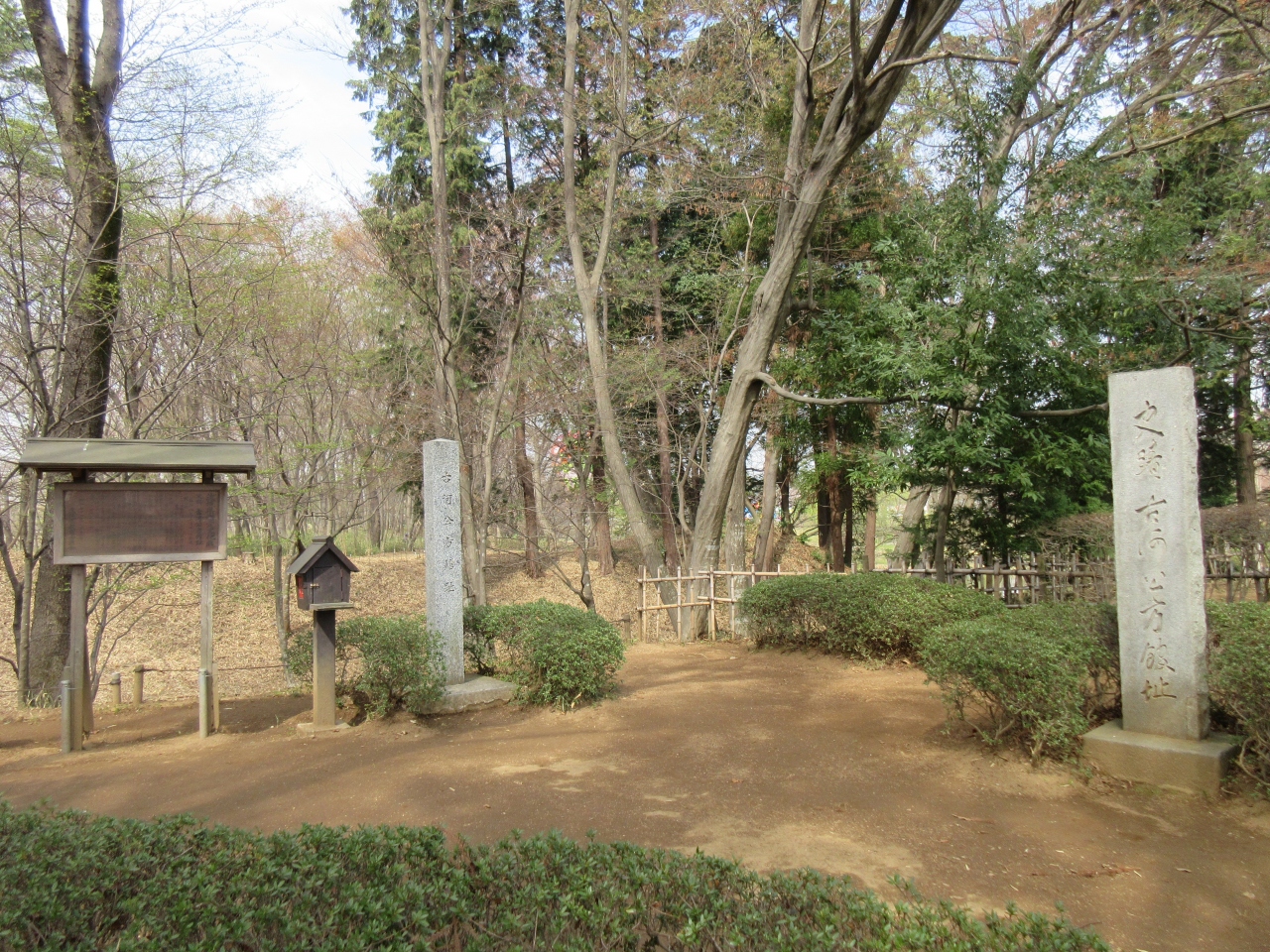 古河市鴻巣にある古河公方公園(古河総合公園)内にあります。公園管理棟そばの沼に囲まれた森の中にある民家園のそばに石碑が立っています。空ぼりが館がここにあったことを示すだけです。説明板があり、1455年に足利成氏が鎌倉から古河に移り2年間居住していたことが記されています。後に下河の古河城に移り以後、古河公方と呼ばれ北関東に一大勢力を誇りました。今は木々が茂る台地があります。古河の歴史を知ることができる場所です。花見がてらに寄ることをおすすめします。