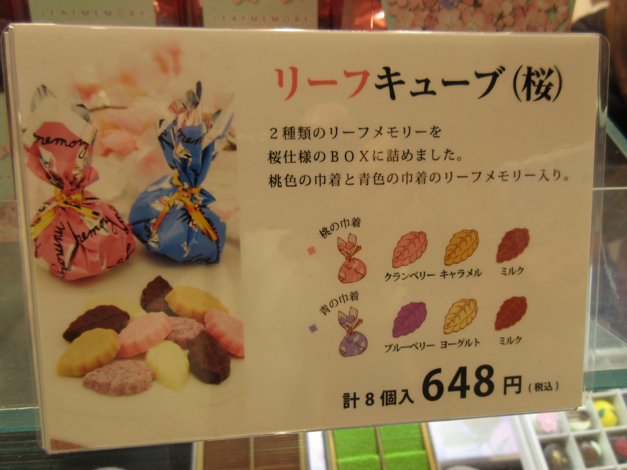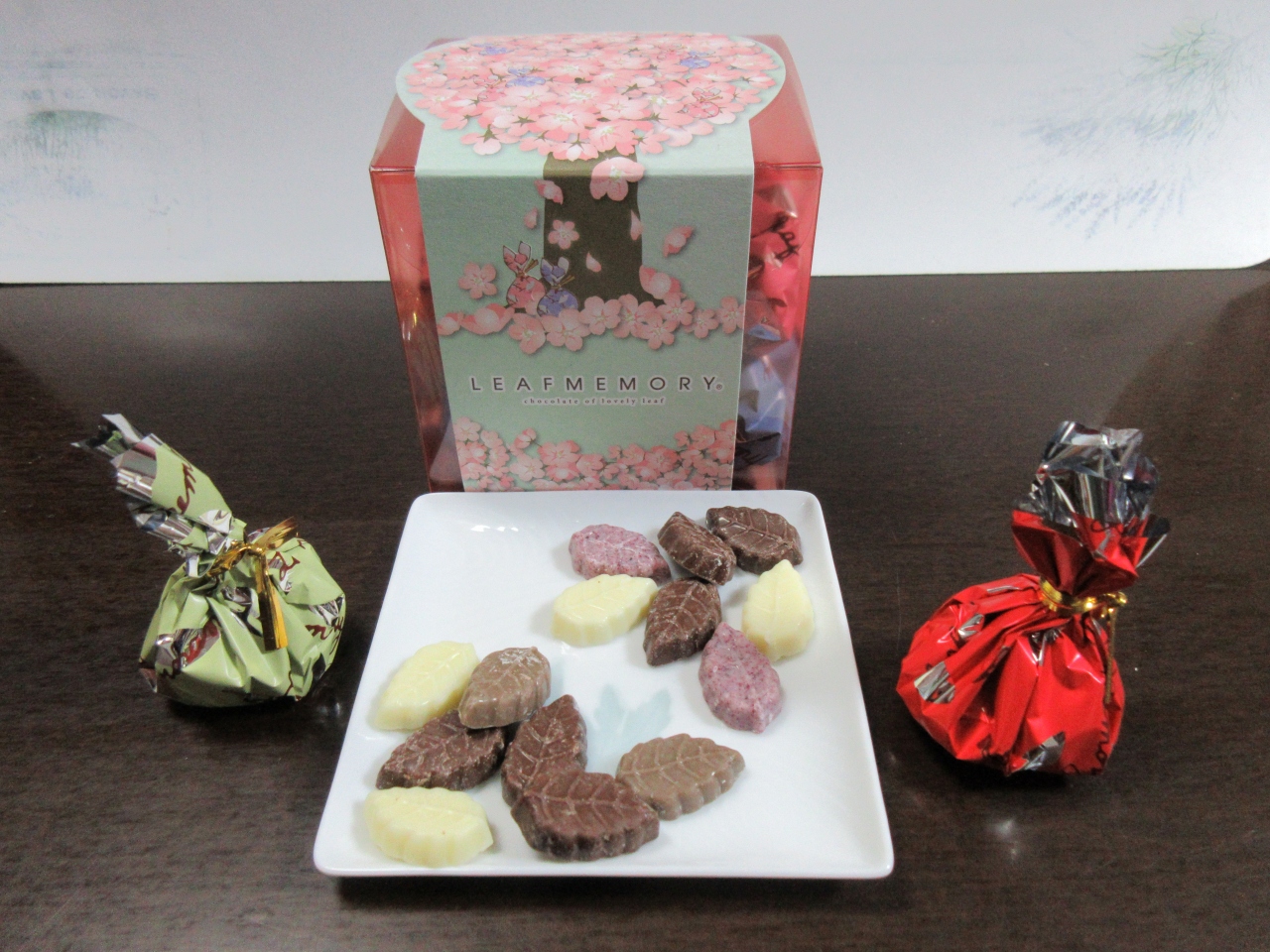 神戸で泊まったホテルのコンシェルジュに神戸土産に何がいいか聞いたところ、いくつか教えてもらいました。「チョコレートならモンワールをおすすめします」の言葉で三宮センタープラザ1階にあるモンワールへ行きました。軽くて可愛らしい包装のリーフチョコレートを買いました。女性が好みそうな春の限定リーフキューブ桜とプチパックをいくつか買い土産に配りました。1つの茶巾に3種類の味の小さな葉形チョコレートが入っています。ほんの少しチョコレートを食べたい時にいいでしょう。女性に喜ばれました。