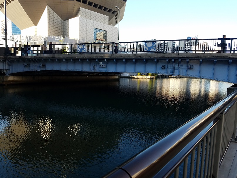 橋自体は平坦で飾り気の無い外観ですが背景になんばHatchがあったりするのでつい写真を撮りたくなりますね。