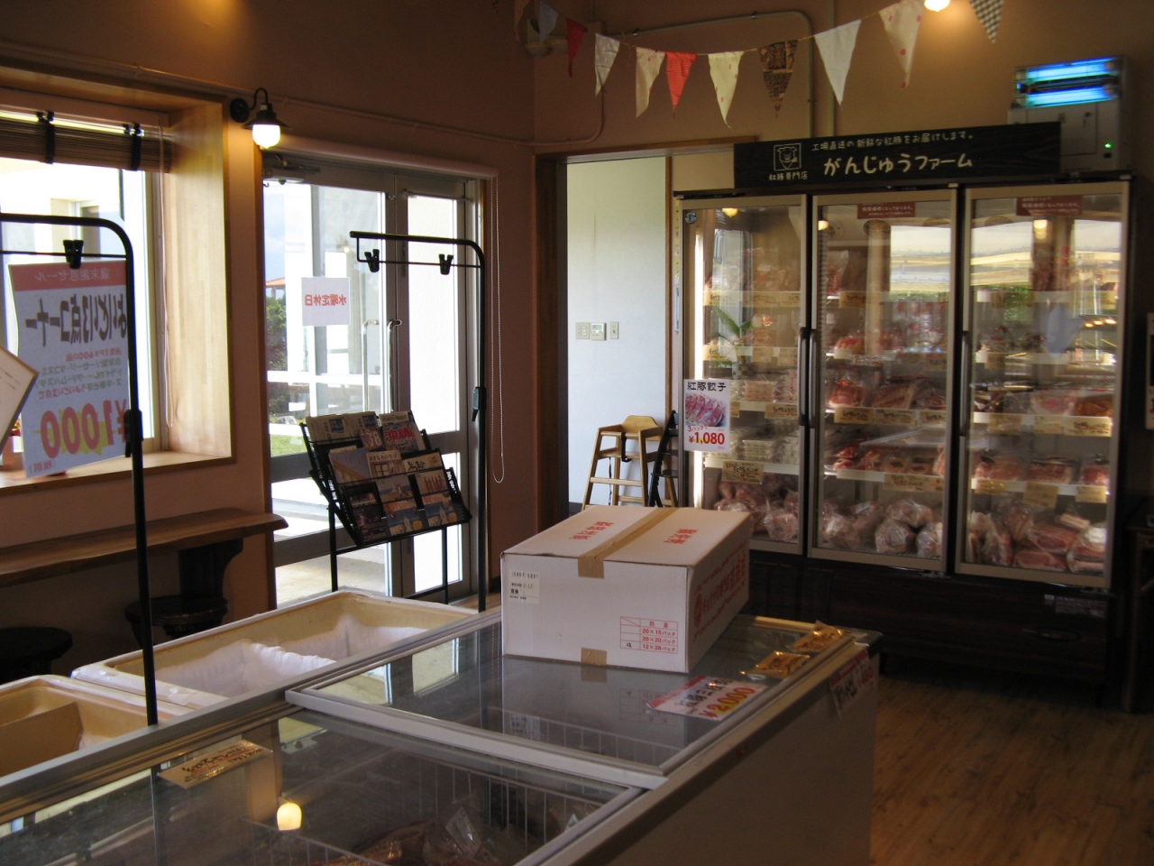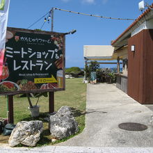 お店は読谷村の渡具知ビーチの際にあります。店内に入ったところは精肉を販売するスペースと、ご飯・豚汁・サラダバーなどのコーナーになっています。