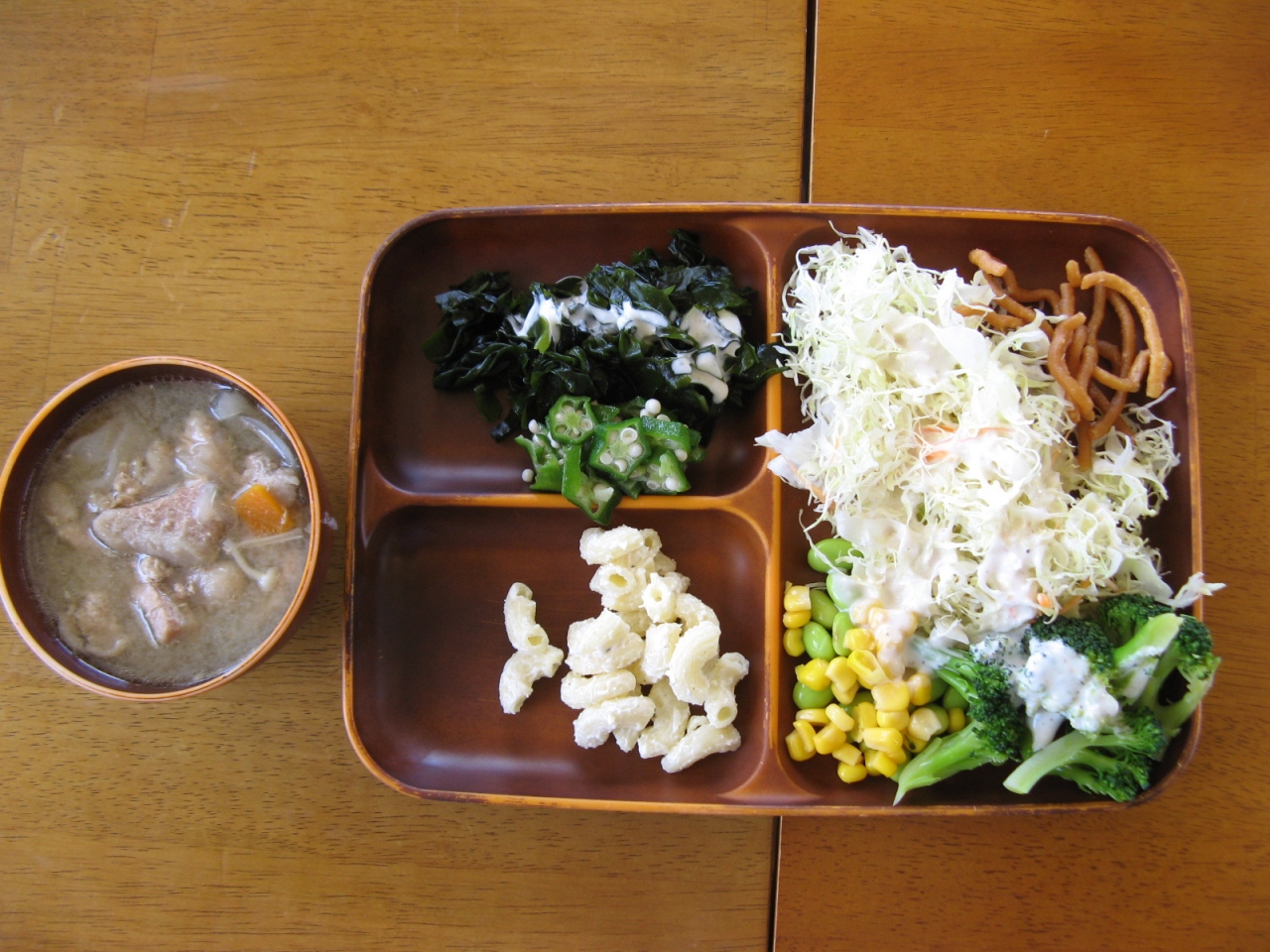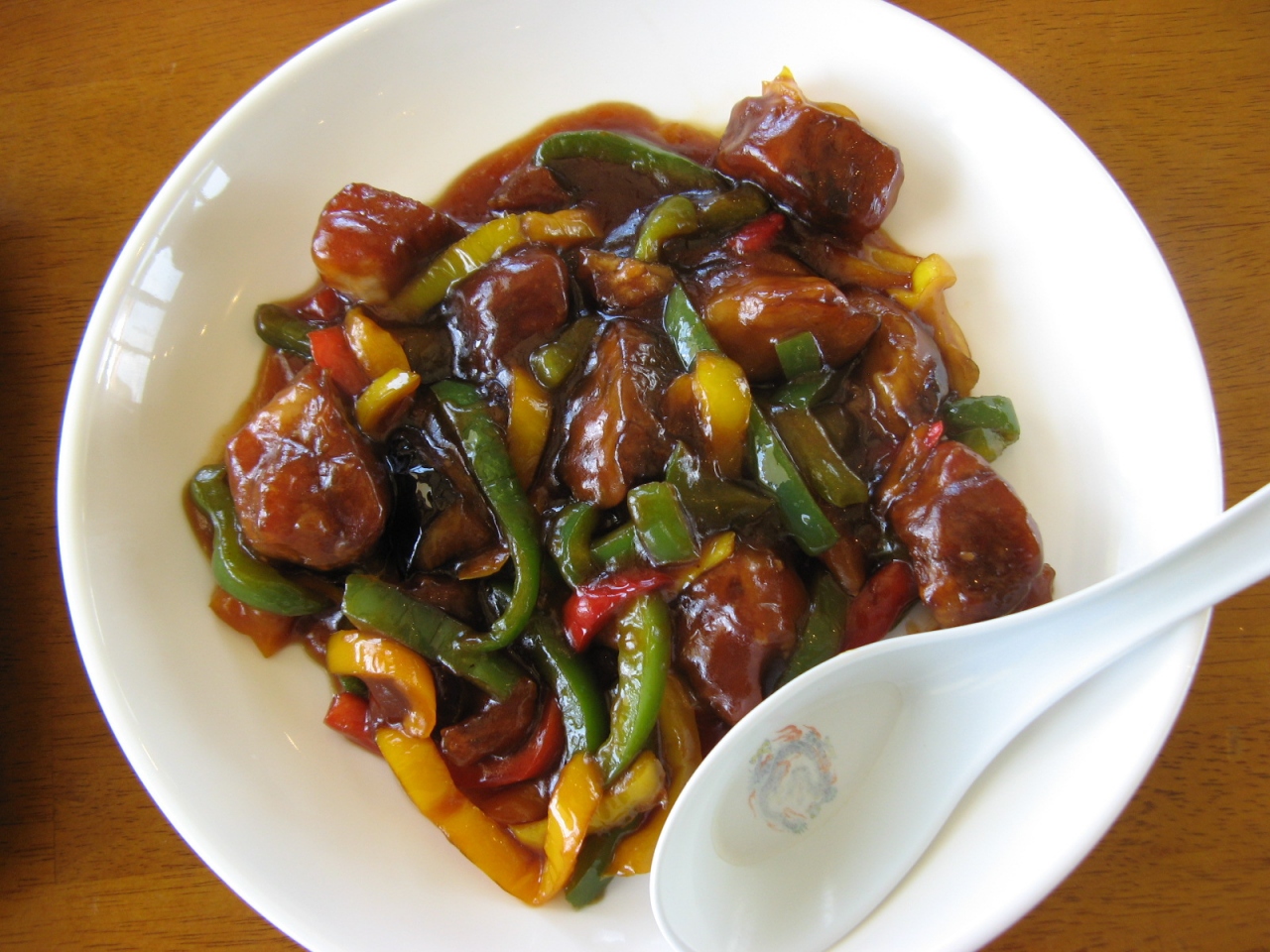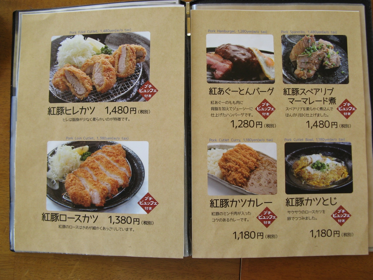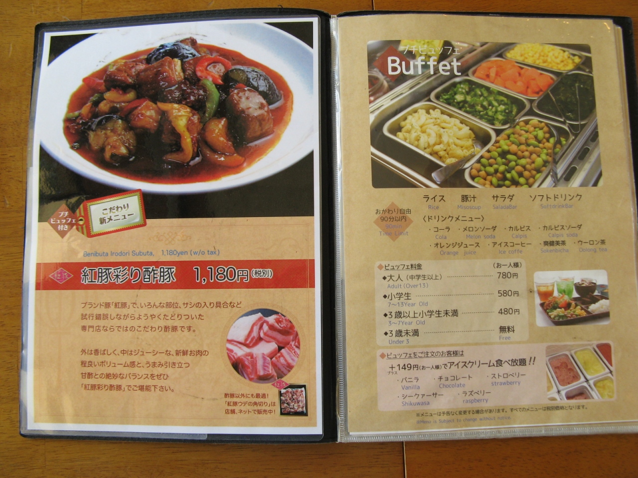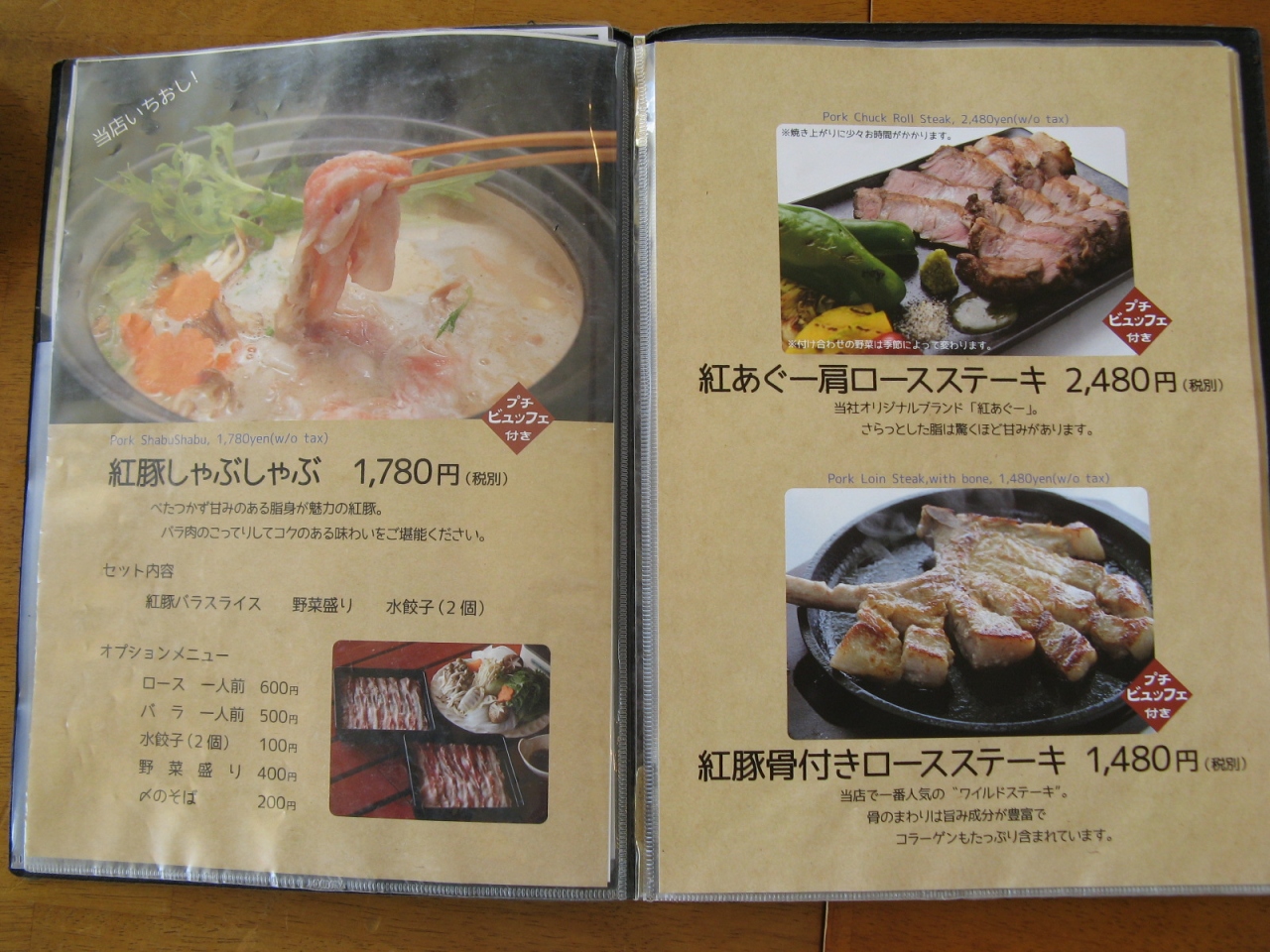 オーダーしたのは、私が“紅豚色彩酢豚1180円+税”、相方が“紅豚骨付きロースステーキ1480円+税”、それぞれに食べ放題のご飯と豚汁、サラダ、ソフトドリンクが付いていました。“紅豚色彩酢豚”の豚肉はとても柔らかくて味付けも抜群でとても美味しかった。また、豚汁はとても具沢山で汁もコクがあって美味しかったので三杯もお代わりしてしまいました。