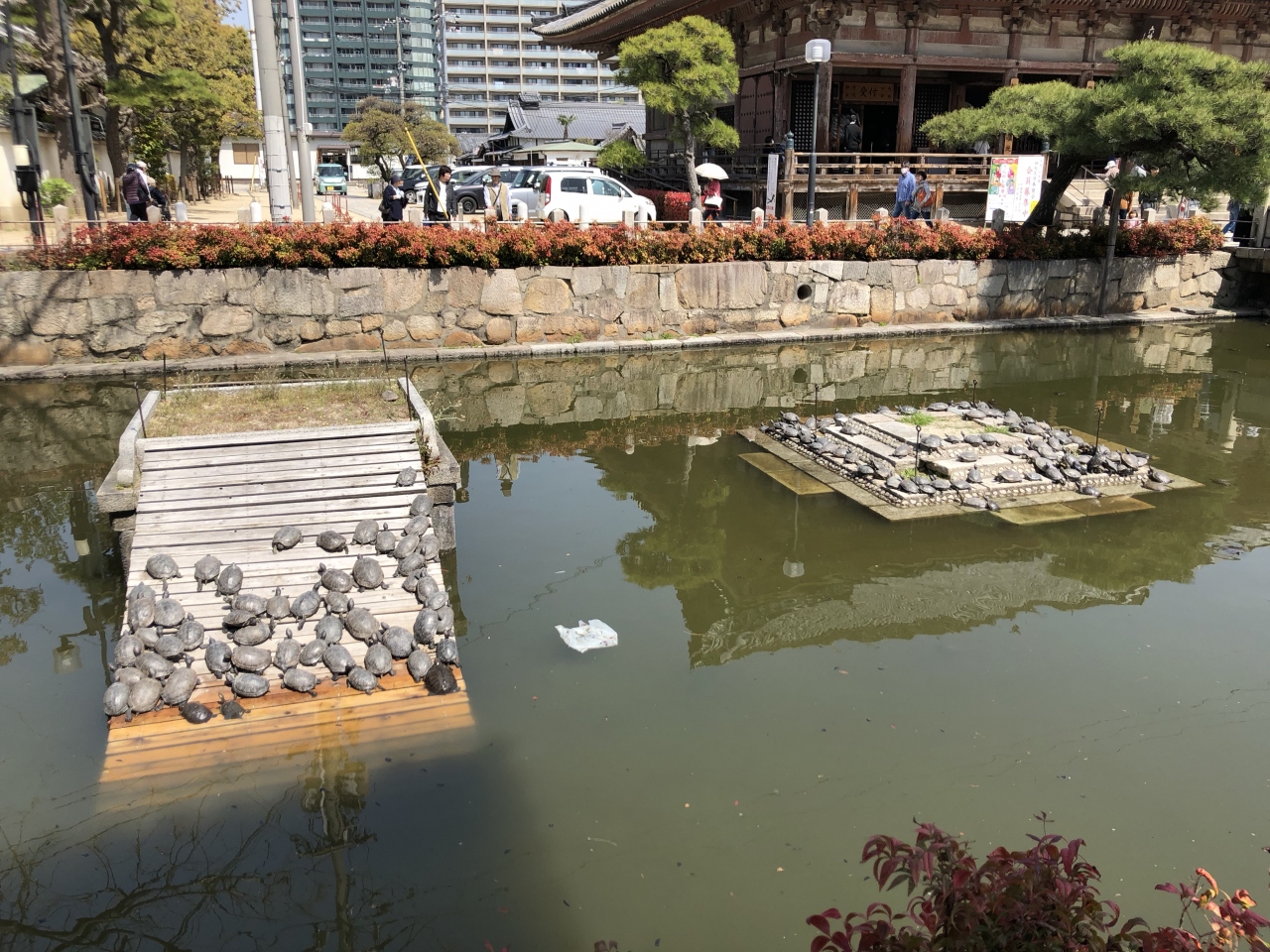 四天王寺の伽藍の北側、六時礼讃堂の前にある四角い池です。亀の池という名前が付いていたので、ついつい見に行ったところ、びっくり。何十匹というカメが甲羅干しをしていました。ほかにも、水面を泳いでいるカメ、別のところで甲羅干しているカメなど、明らかに百匹以上はいました。こんなの初めて見ました。