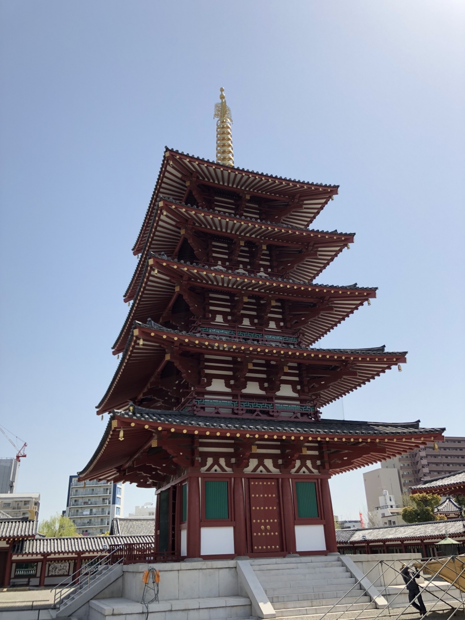 聖徳太子が建立したとされる四天王寺には大きな五重塔があります。もちろん、建設当時のものではなく、戦後に鉄筋コンクリートで再建されたもの。ただ、再建しようということになることは、この寺を信仰する人が多いということですね。中は階段だけですが、登ることができます。眺めはいまいち。