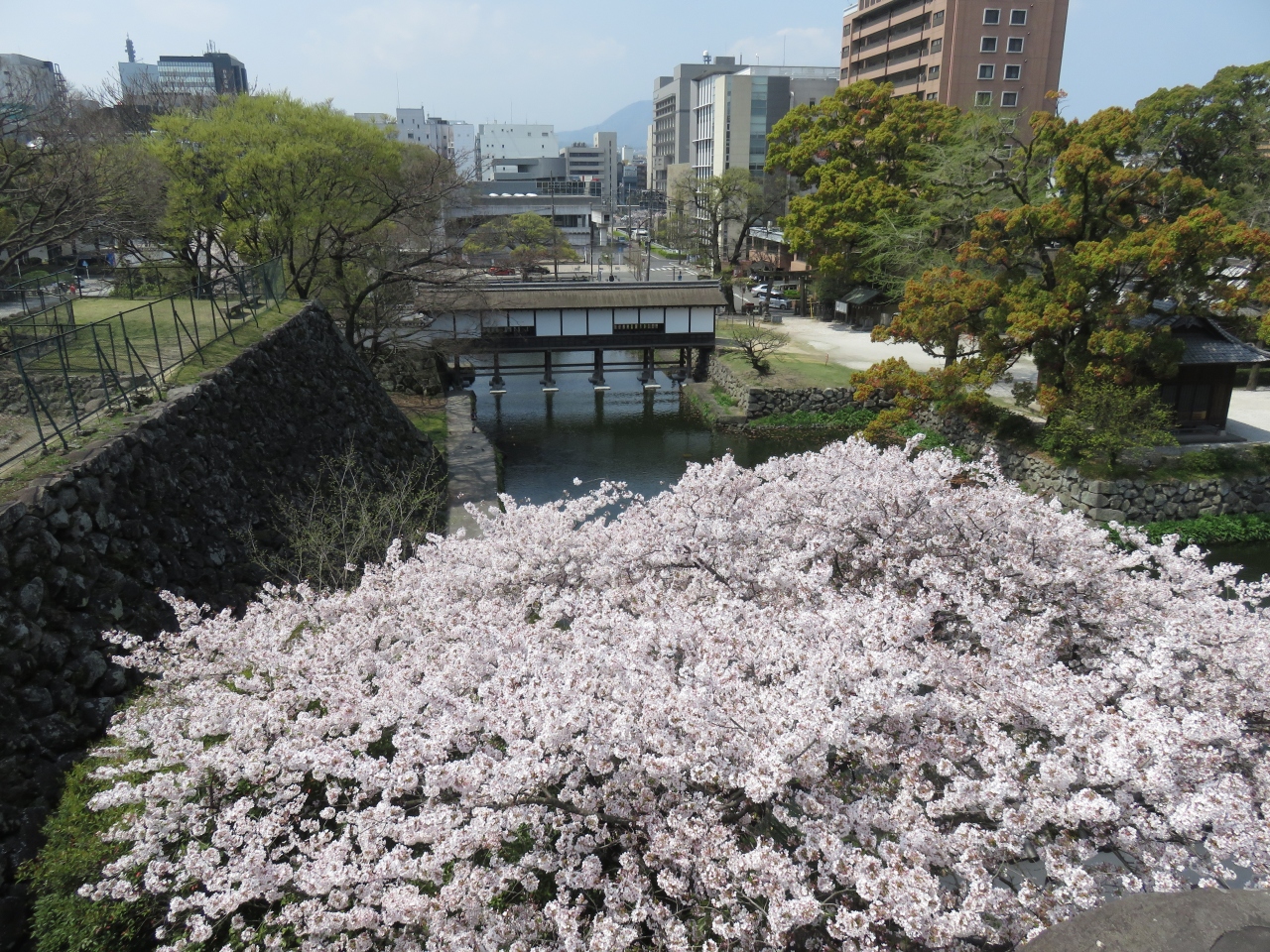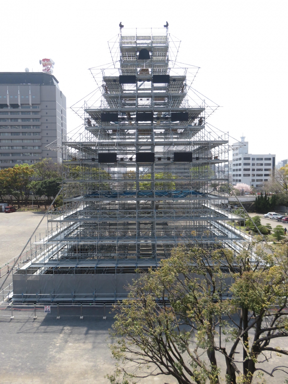 外堀のあたりを歩いて、内部に入っていくと、工事中のような箇所が目立つ。天守閣があったらしい小高いところには鉄の階段で上がると、見晴らしはいい。桜が咲いていたので眼下の庭園と桜が見えた。鉄パイプの天守閣のようなものが見えたが、、。もう少し整備しないと、ちょっと。。。外から石垣とお濠を見ただけでいいかも。。