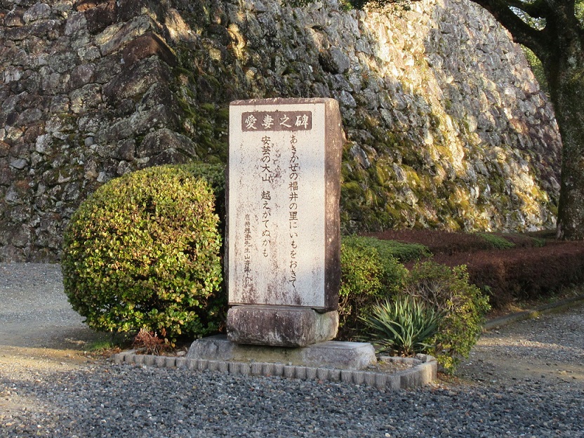 高知城見学の際、板垣退助の像を右手に身ながら石段を上がると、三の丸の立派な石垣の手前に「愛妻の碑」が建っていました。山内一豊の妻の銅像はビジュアル的も分かりやすいのですが、こちらは表現も難しくて、何の意味か最初はさっぱり分かりませんでした。単身で認知に赴く夫が妻を思って詠んだ歌とのことで、2度読み返しましたがストレートには意味が掴めませんでした・・・。