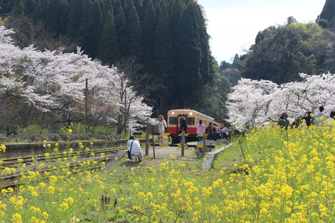 春の小湊鉄道は桜や菜の花が沿線に咲き乱れますが、特に桜と菜の花のコラボが美しいのが飯給駅と月崎駅です。