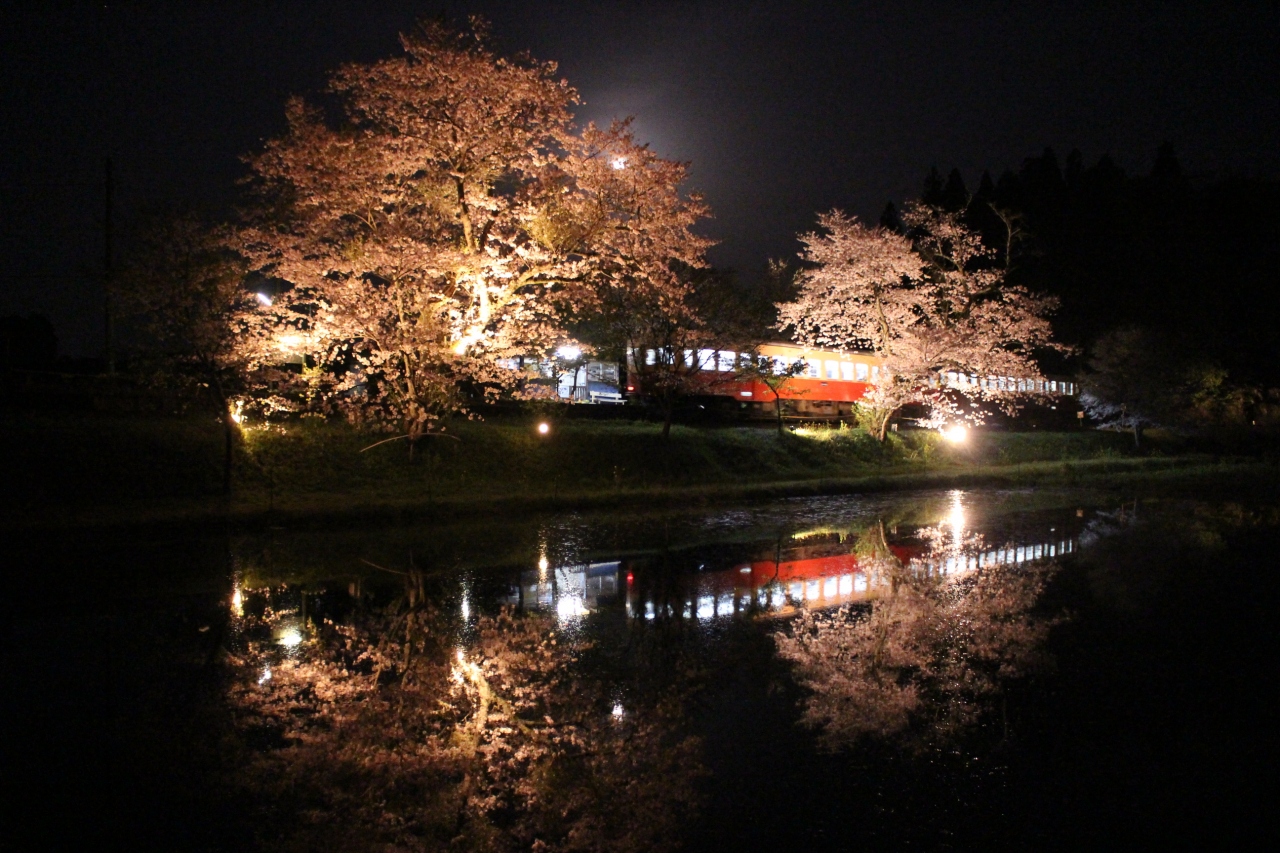 飯給駅では桜の木と菜の花に加えて水田の水鏡が美しく、多くの鉄道好きや写真愛好家が訪れていました。