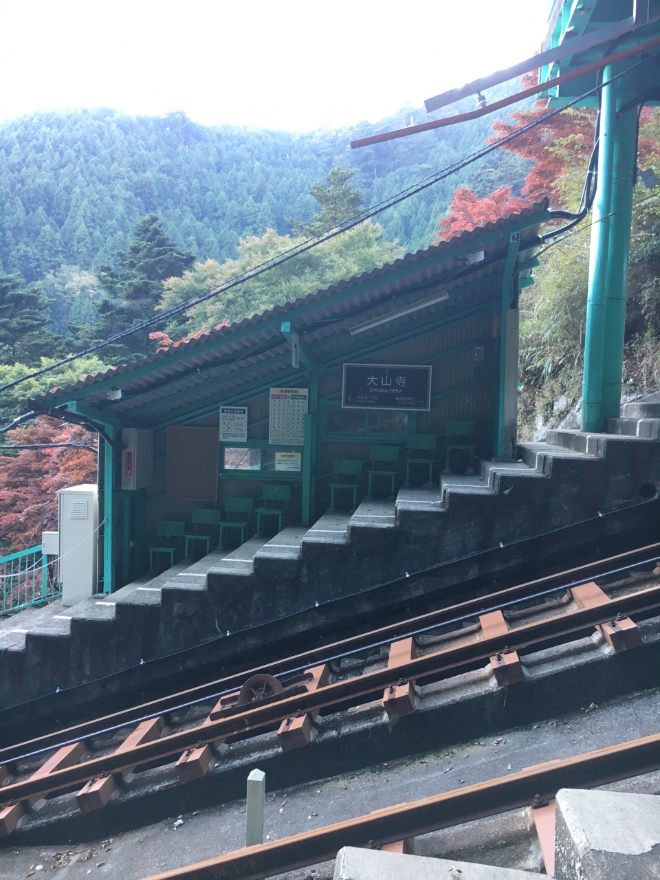 途中の大山寺駅で、反対側のホームを見るとホームも斜めで椅子も段々になっていて、屋根も斜めなので、他ではなかなか見ることのできない駅の眺めでした。
