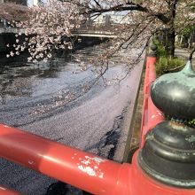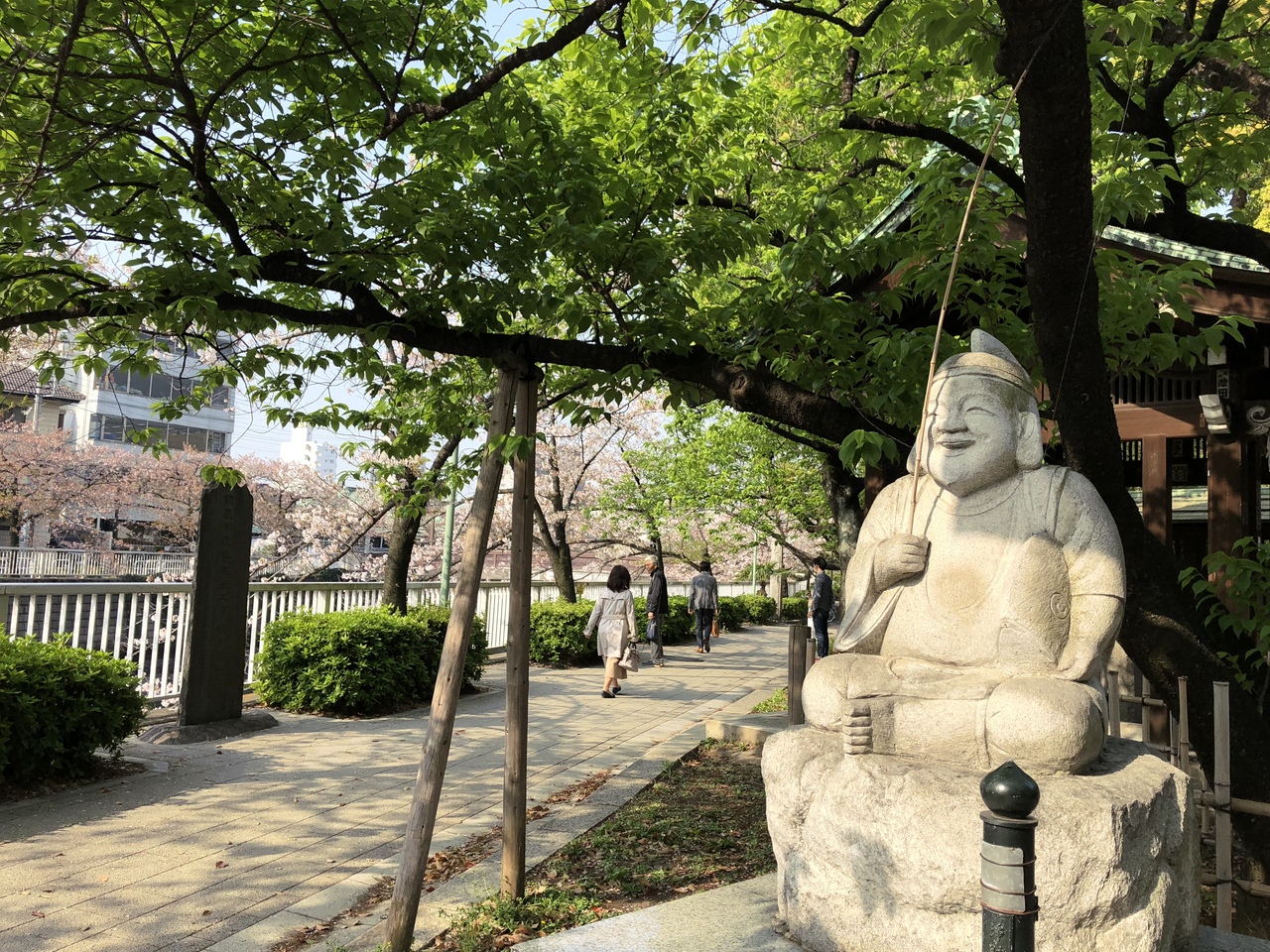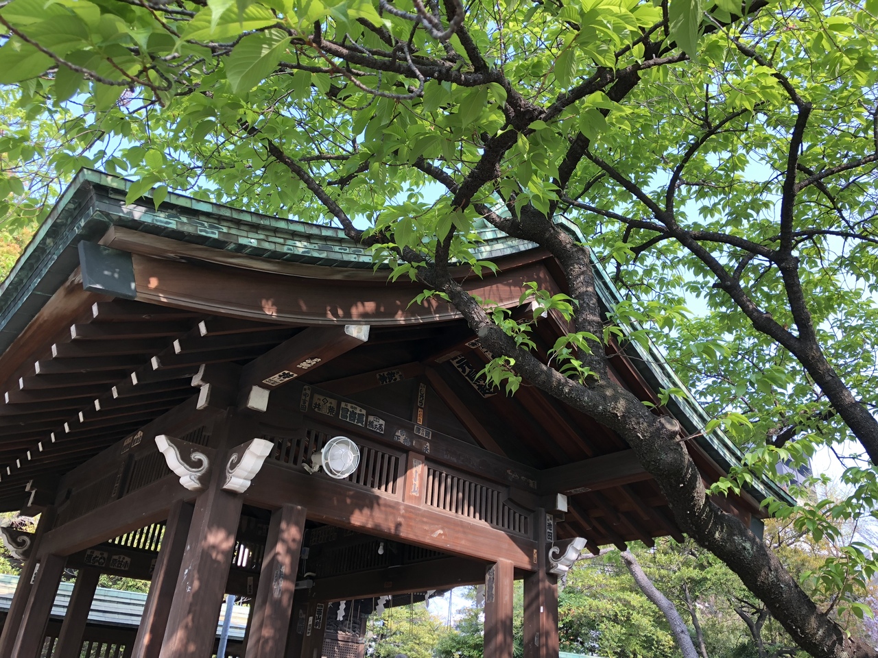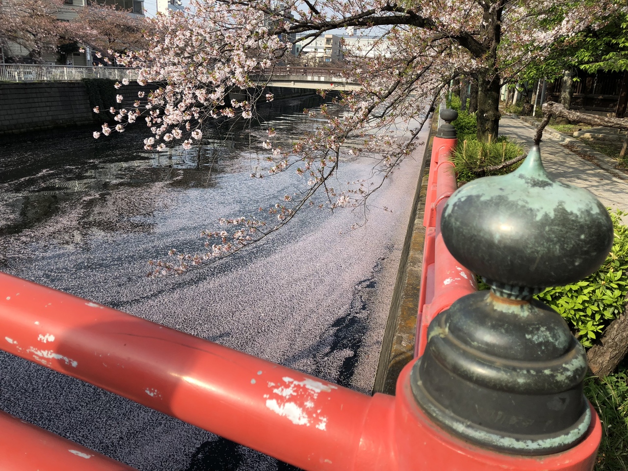 赤く塗られた手前の鎮守橋からのぞむ荏原神社の新緑は品川百景に選ばれているとのことで、なるほど、散る桜と新緑のコントラストがとても美しい光景でした。