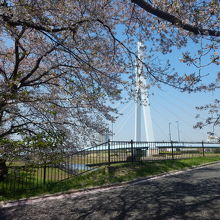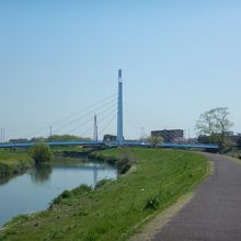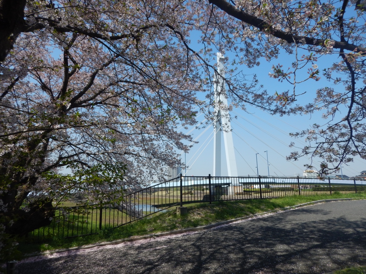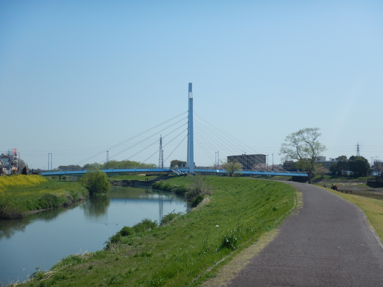 橋周辺の元荒川の堤には名の花がや桜が咲いている。葛西用水にはまだ水が入っていない。あと1か月もすると水が入り、田植えの季節となる。この橋から市役所の当たりまでは葛西用水散策路になっており、チューリップが植えられていて、ちょうど見ごろだった。
