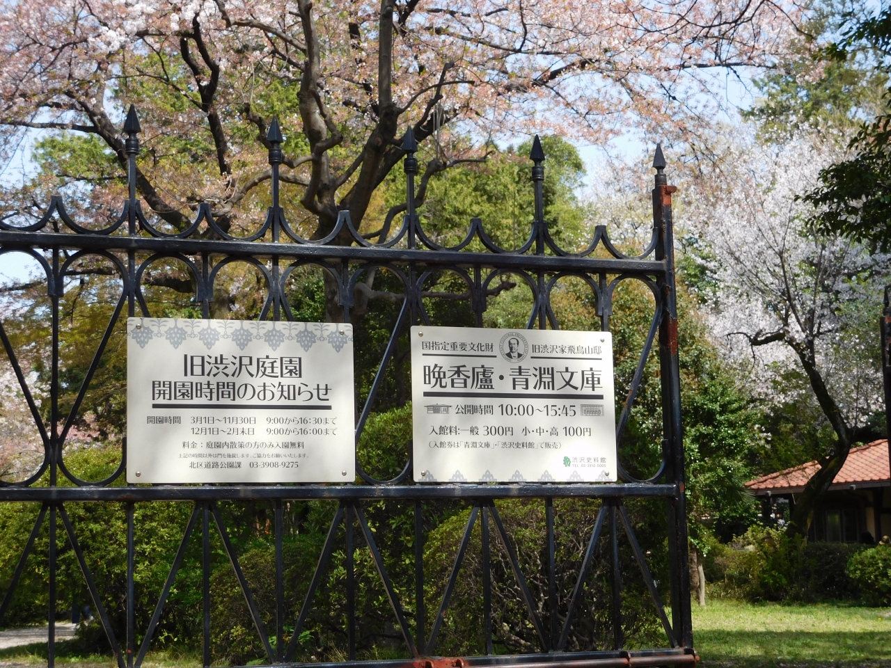 飛鳥山公園内の「渋沢資料館」の斜め向かい側にある庭園です。庭園内には渋沢資料館のチケットで見学の出来る「青淵文庫」と「晩香廬」があり、庭園内自体はチケットが無くても自由に入る事が出来ました。ちょうど桜の季節で、桜の大木が満開になっていて、とても綺麗でした。ちょっとした広場もあり、小さな子供が遊んでいたりしました。割と人が少なく、お花見には穴場的な場所でした。