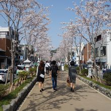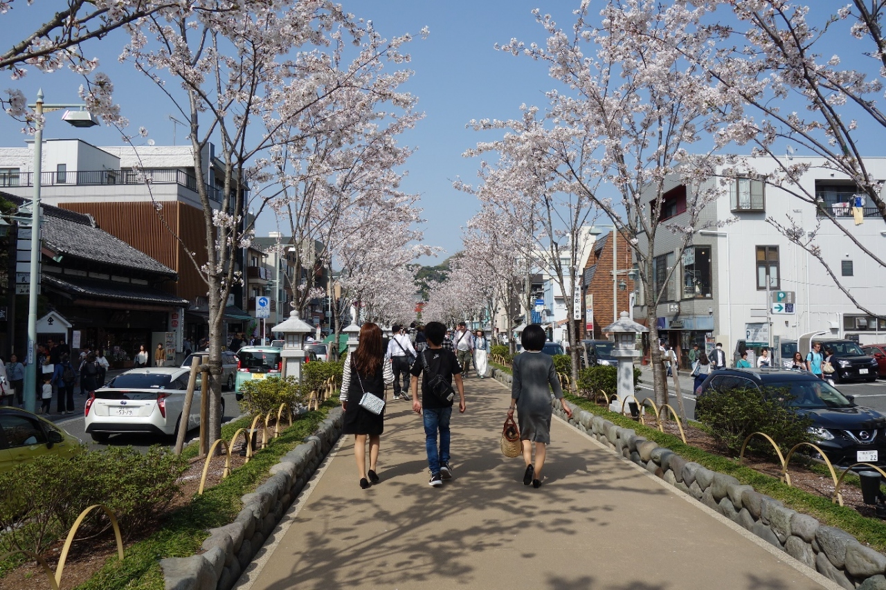 鎌倉の鶴岡八幡宮前にある歩道です。二の鳥居から八幡宮まで続いていて両脇の車道に比べて一段高くなっていますので安全に八幡宮へアクセス出来ます。ちょうど両脇に植えられた桜が満開で素晴らしい景色を見せてくれていました。