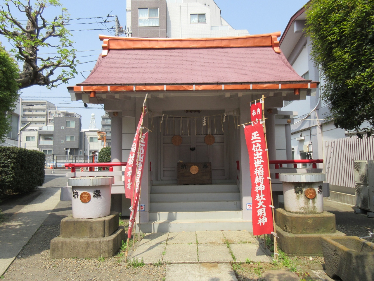 若松河田駅から歩いて3分の住宅街にある稲荷神社です。太田道灌によって鎮座された稲荷神社で祭神は倉稲魂命で衣食住の守護神です。コンクリート造りの白い壁とエンジの屋根の社殿は扉が閉まっていました。石造り鳥居の前には児童遊園があります。訪れた平日午前は人がいませんでした。出世稲荷神社の近くに新しく広い道路が建設されるようで広く長い土地が柵で囲まれていました。地元の移り変わりを見守る稲荷神社です。建物としての見ごたえはないです。