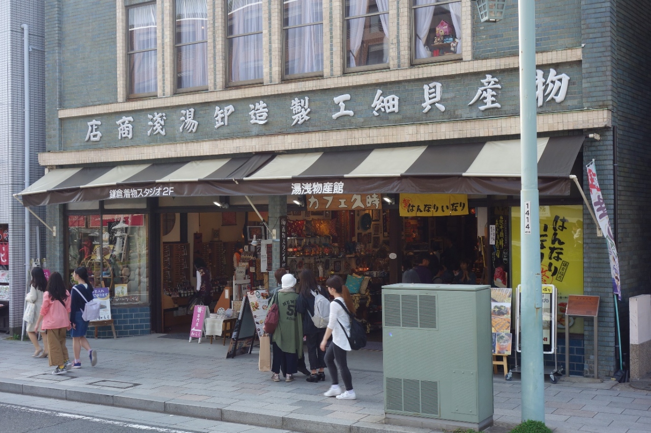 鶴岡八幡宮に近い若宮大路にある商店です。看板建築の建物で鎌倉市の景観重要建築物に指定されているのだそうです。二階部分に六個の半円形の窓が並んでいて美しい外観の建築物でした。物産店として営業していました。