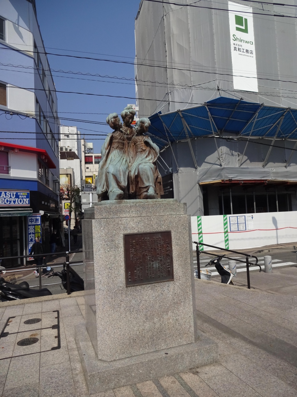着物姿の若い3人の女性の銅像が設置されている。