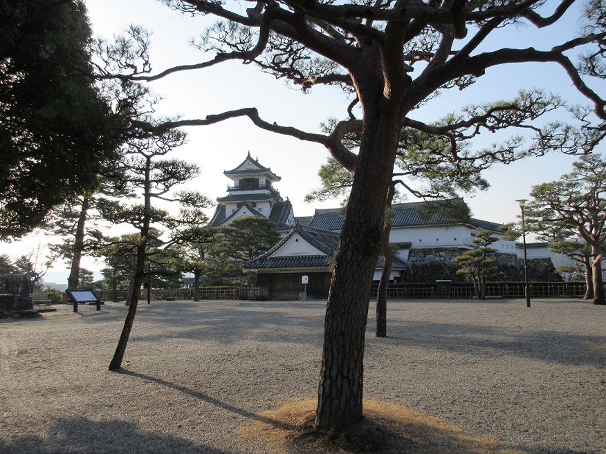 高知滞在中、三回訪問した高知城。その中で本丸と同じ高さにあり、詰門を隔てて接しているのが二ノ丸です。広場になっていて中心には日の丸がポールに掲揚されていました。御殿など昔があったのでしょうが、今は簡単な売店やトイレがあるだけなので、二ノ丸と意識せずに本丸に渡る方が多かったです。朝訪問した時は詰門がまだ開いていなかったので、二ノ丸から北側に降りて梅の段に行って時間調整をしました。