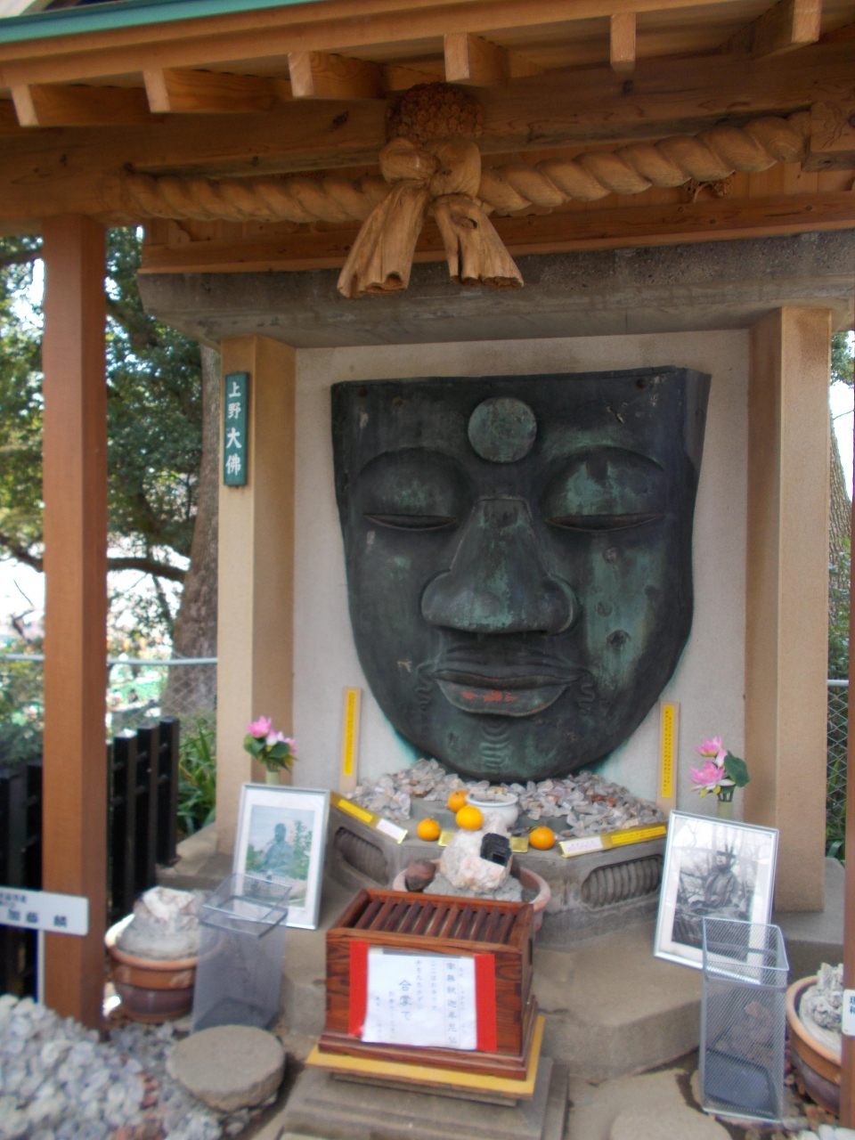この上野大仏は大仏山といわれる小高い丘にあります。現在は昭和47年に寛永寺に残されていた顔面をレリーフとして復興されました。最初は17世紀前半に越後村上藩主が建立し幾度となく消滅し復興されてきました。戦前は6mの釈迦如来座像がありました。また上野大仏の脇に薬師仏を祀るパゴダ様式の供養塔が作られています。顔面のみの大仏もパゴダ様式の供養塔も魅力的です。