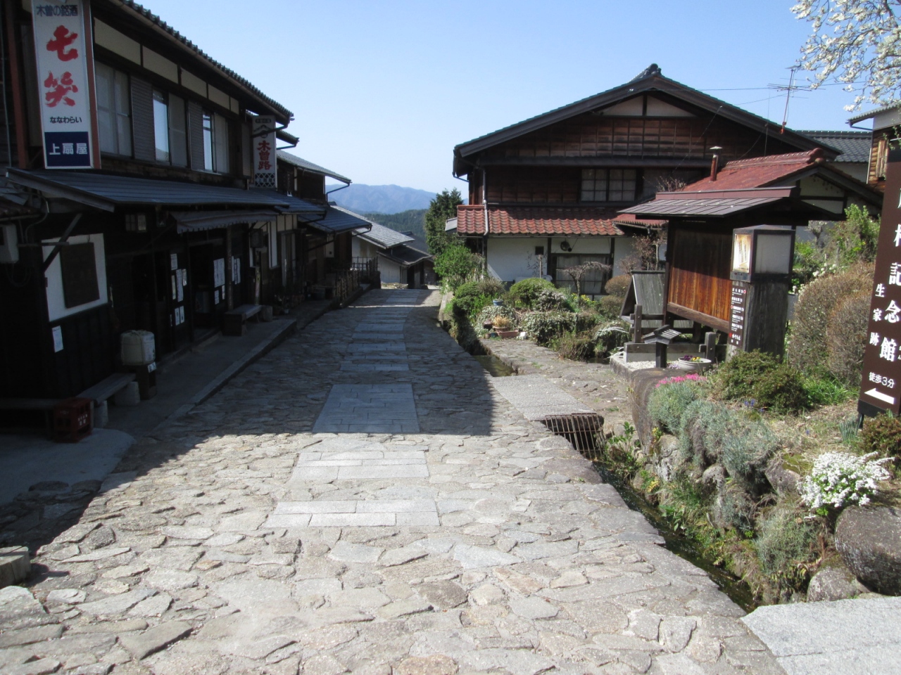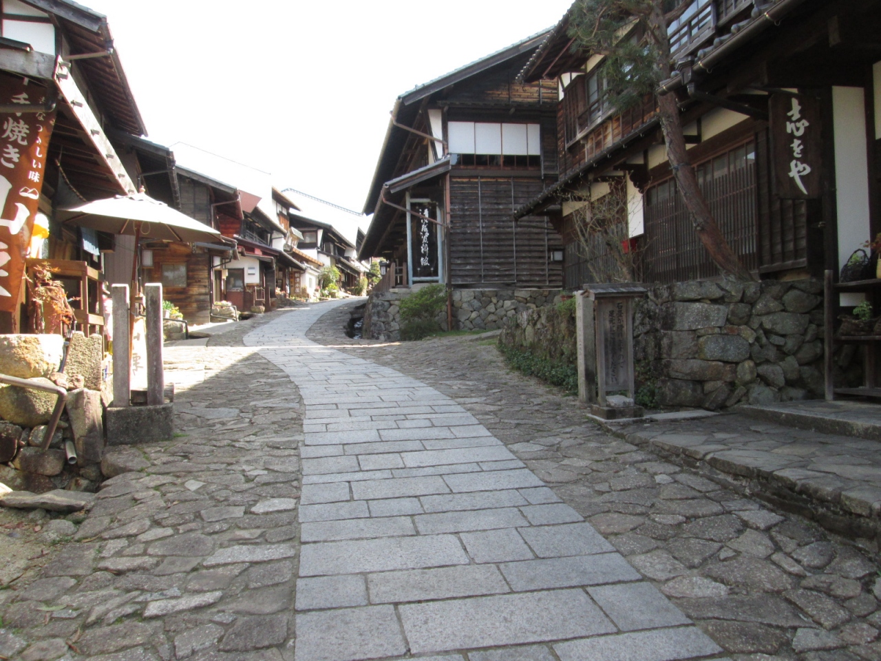 坂道にある旧中仙道の宿場街。石畳と昔の木造の家屋に、古の時を感じさせてくれました。朝早かったのですが、既に外国の観光客の方が散策していました。たぶん泊り客でしょうね。坂の上のほうには「高札」や「展望台」なんかもありました。坂の下から見ても、上から見ても、どこか懐かしさを感じさせてくれます。